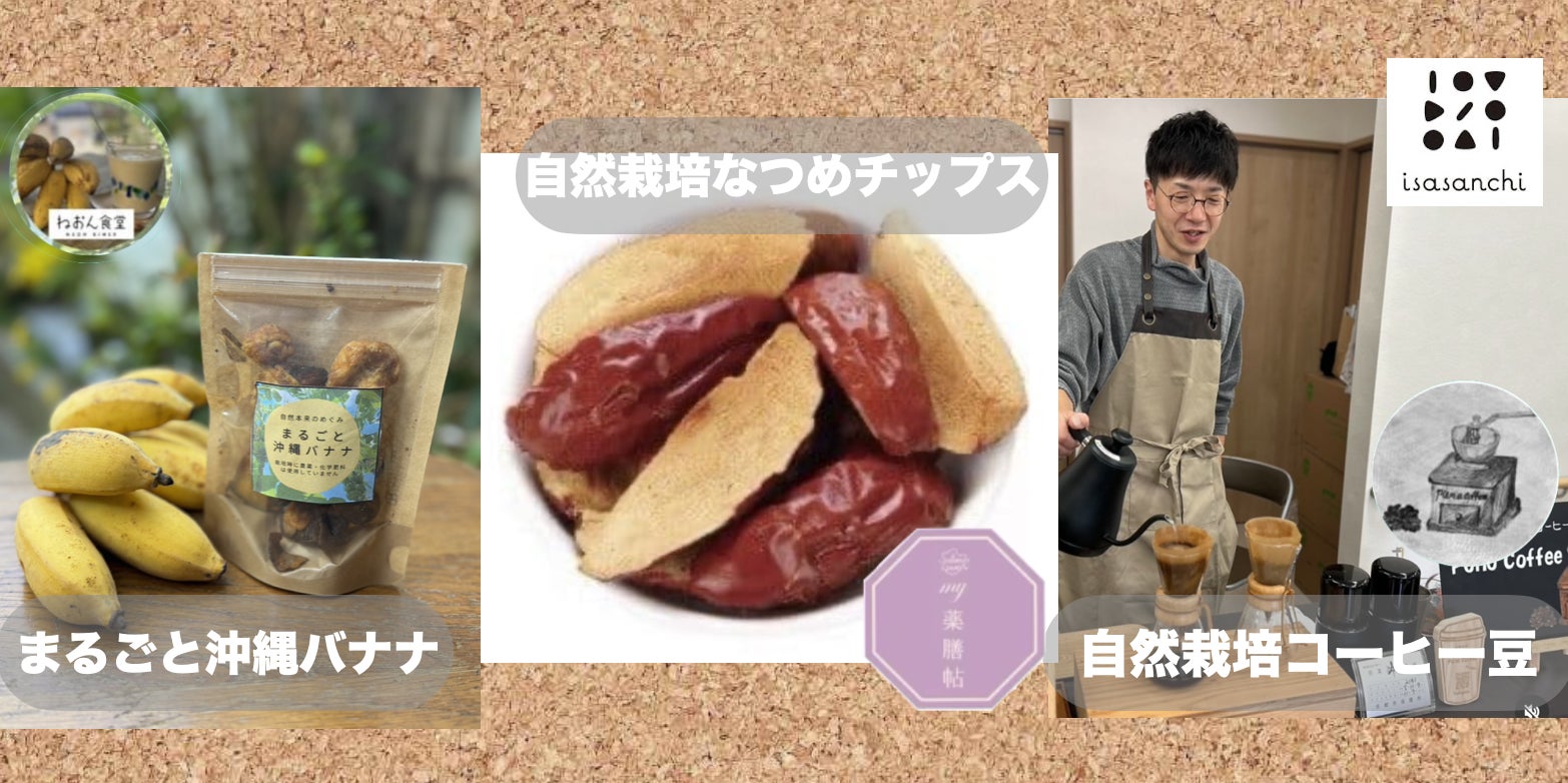 ねおん食堂の皮ごと食べられる沖縄バナナチップ、my薬膳帖の自然栽培なつめチップス、Pono Coffeeの自然栽培コーヒー豆