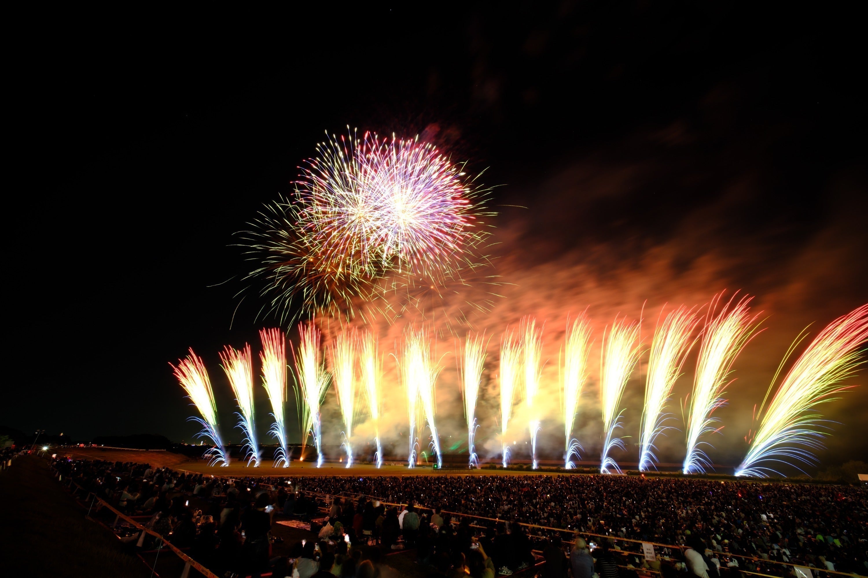 今年の花火大会は来場される皆様の安全対策を行いながら昨年と同等までとは行きませんが昨年に近い規模での花火大会とする計画を立てています。具体的には昨年と同等の雑踏警備対応をさせて頂きながら、皆様に喜んで頂ける内容の打ち上げ花火とさせて頂きます。