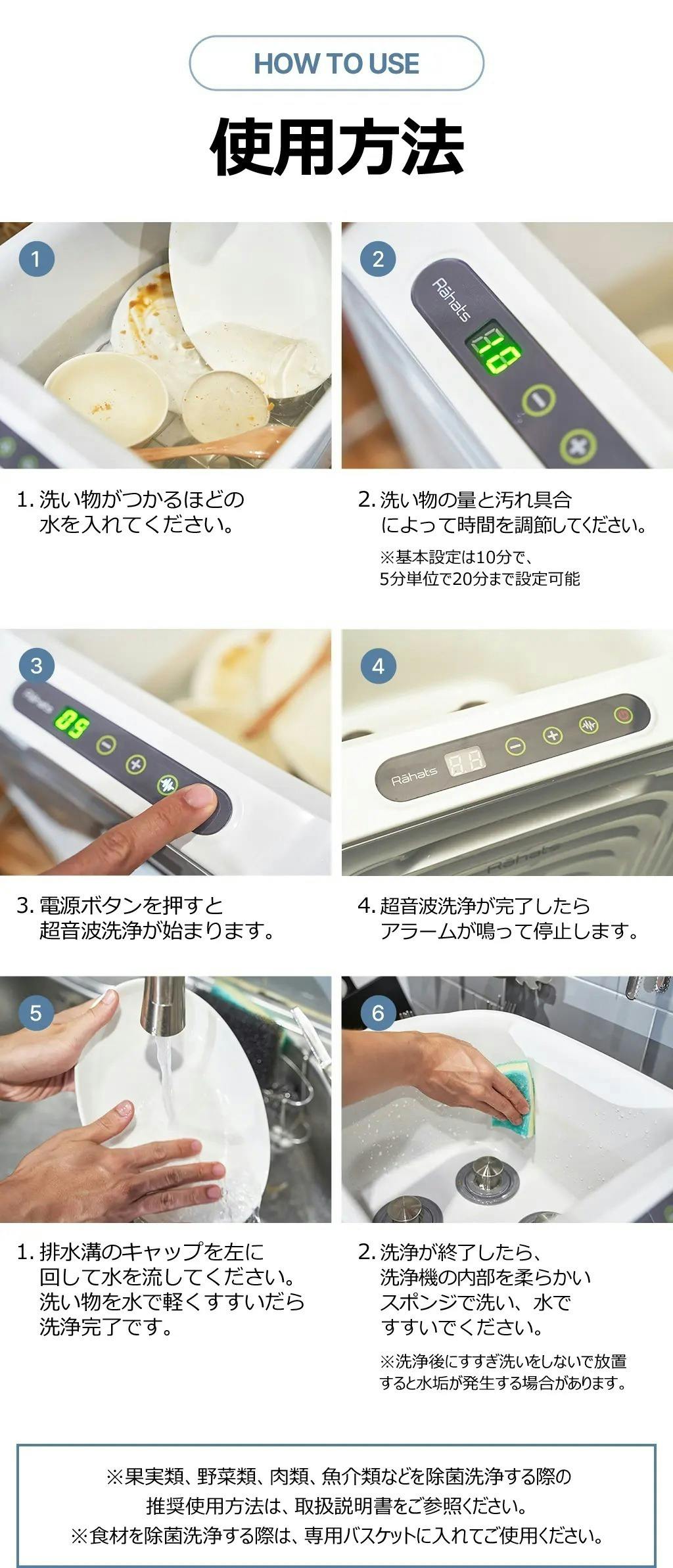 食器を洗っている間、水道を流しっぱなしにしていませんか?「Rahatsマルチ超音波洗浄機」は、貯めた水に洗い物を入れておくだけでいいので、水の使用量も節約できます。