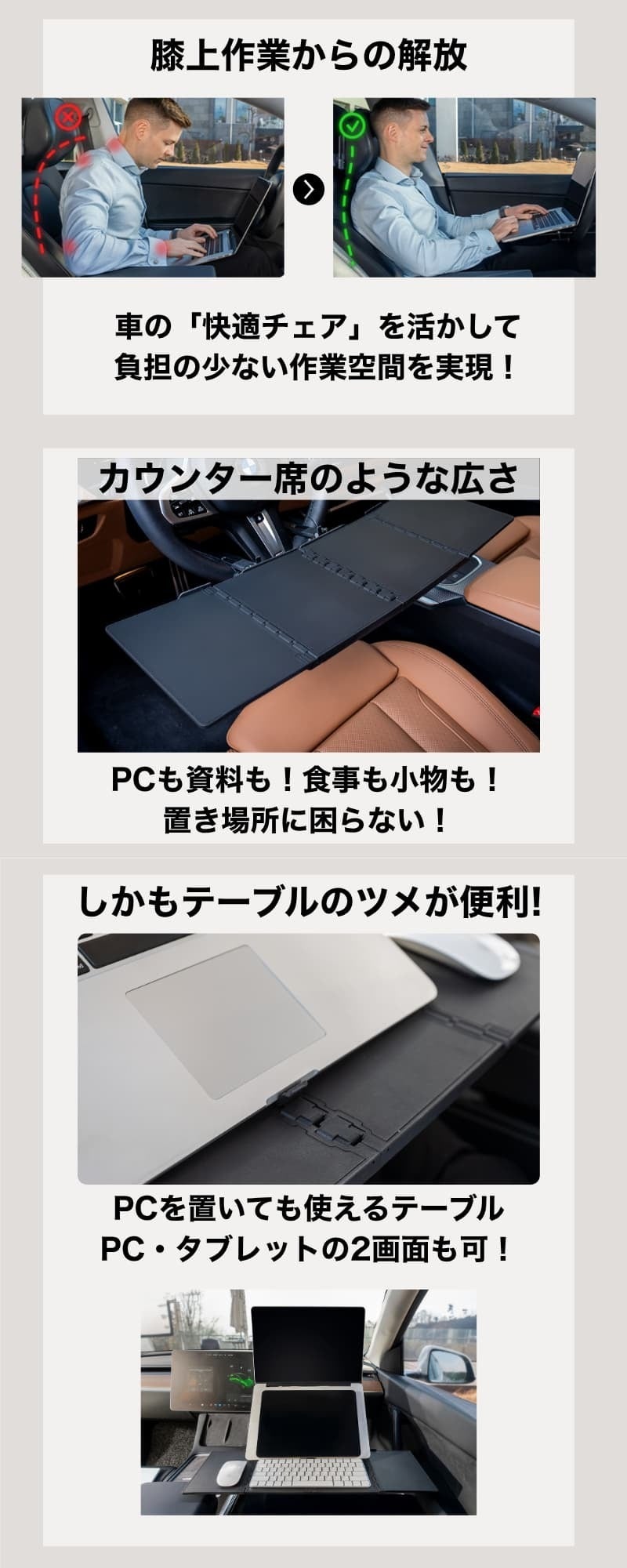 車のハンドルに取り付けるだけで、移動中でも快適に作業できる“極上の車内テーブル”。