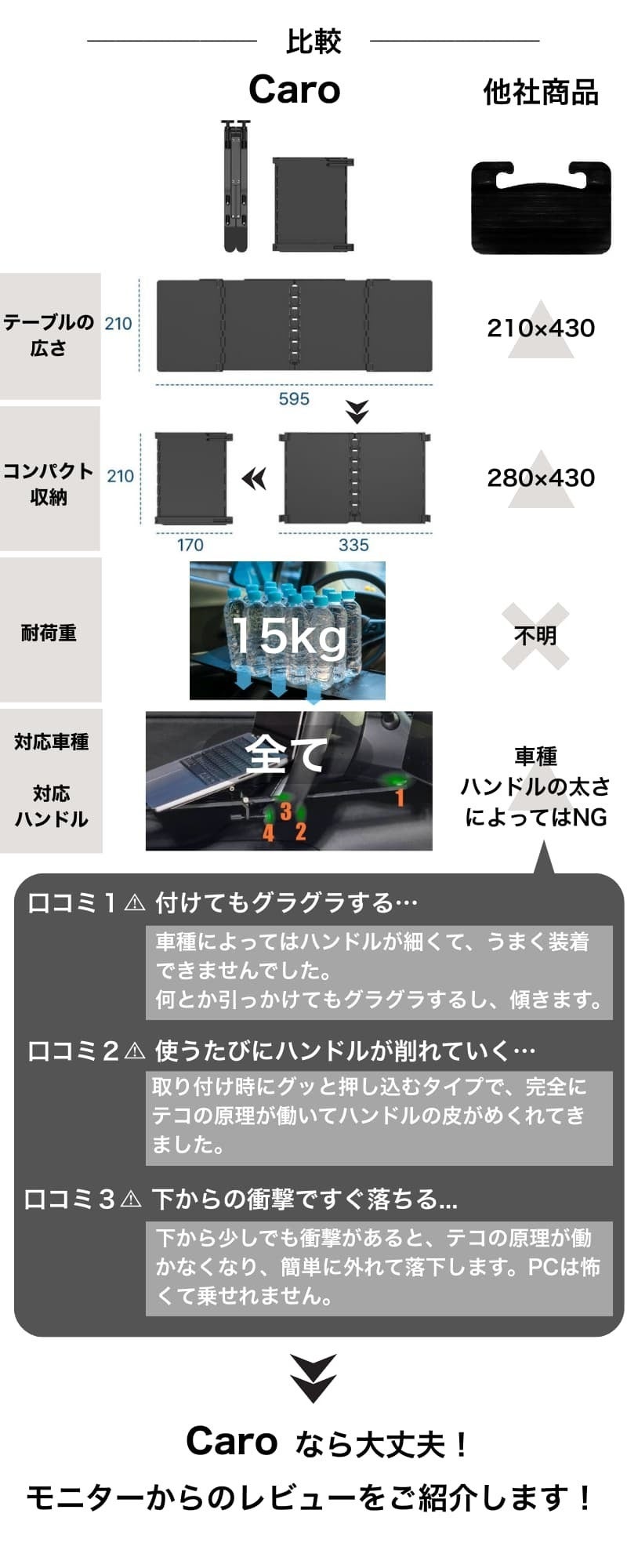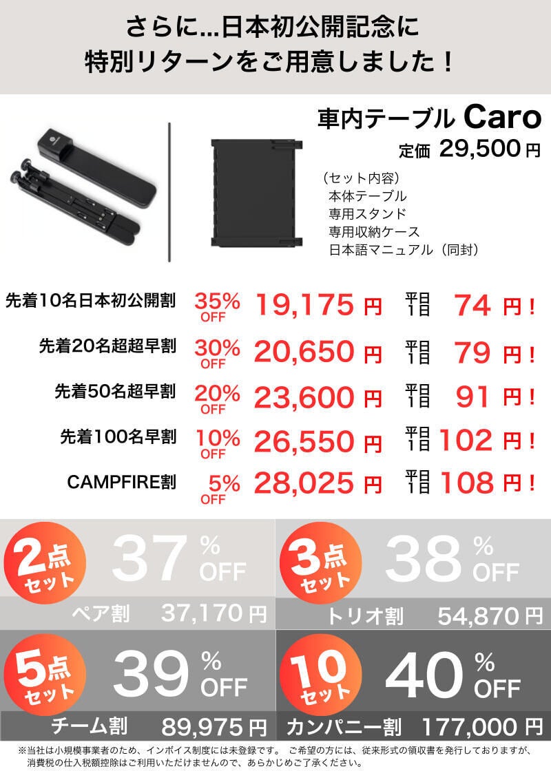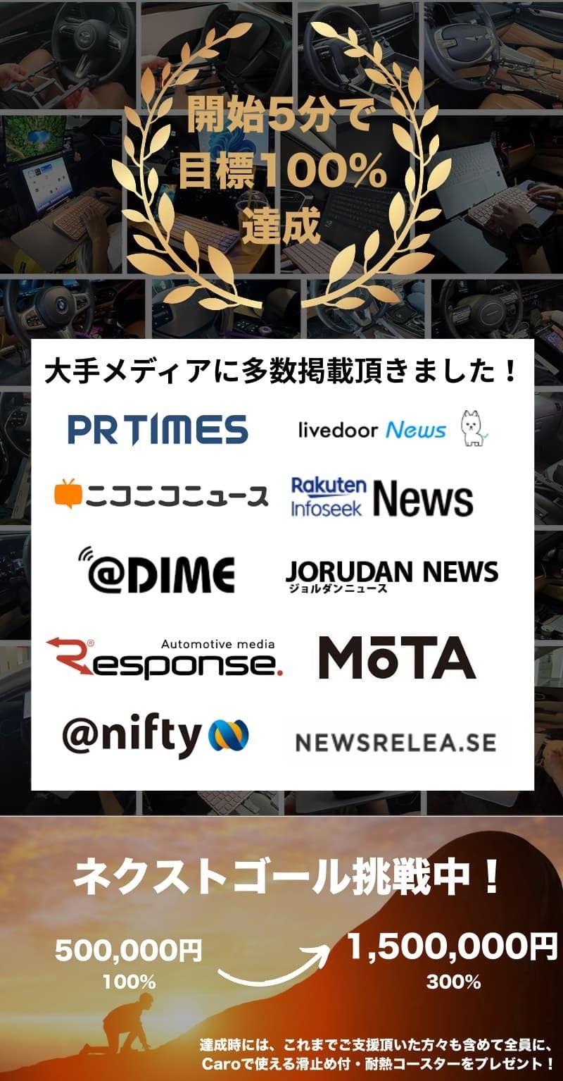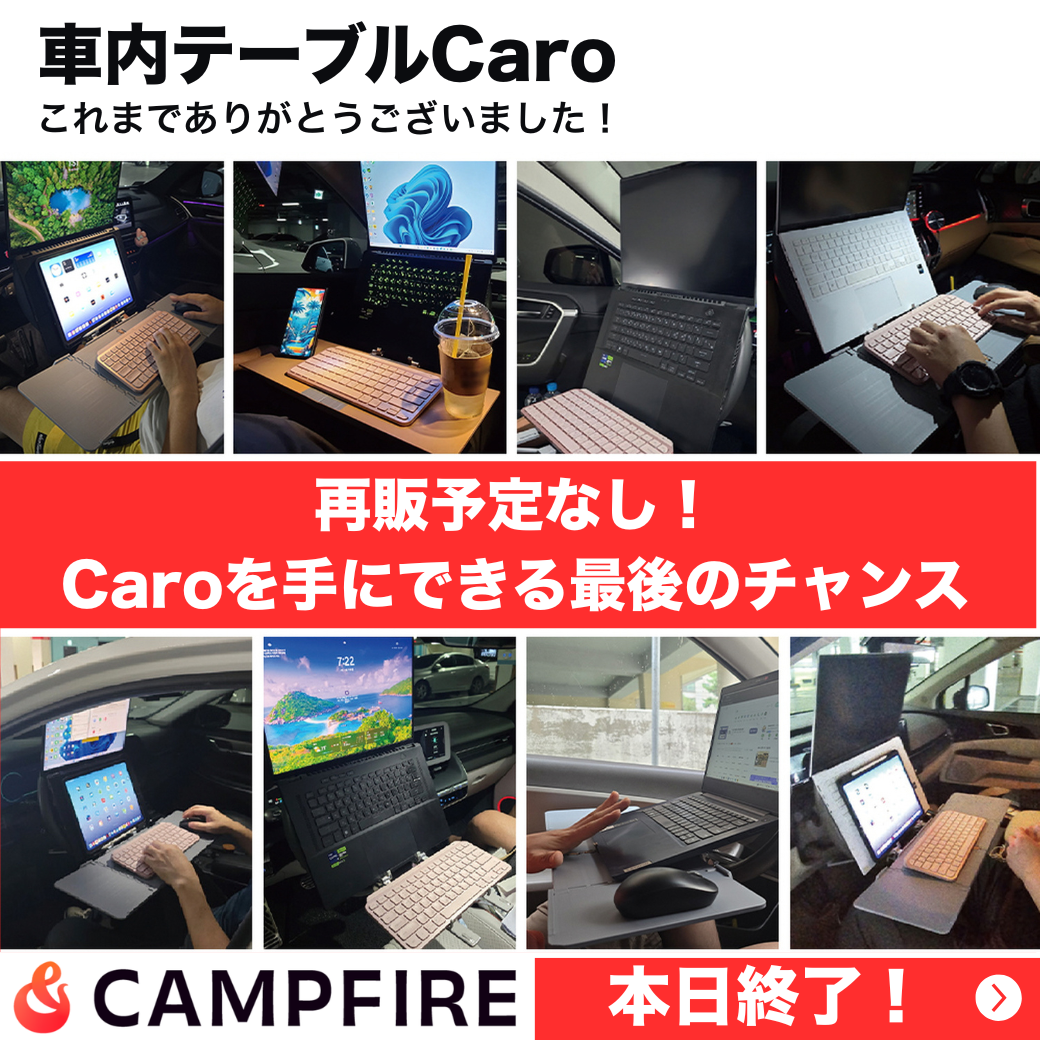 2025/09/30 10:30ここまで本当に多くの方に応援いただき、Caroはついに──\\セカンドゴール目前!そして本日終了です//ここまで支えてくださった皆さまに、心より感謝申し上げます。Caroは「ただの車内テーブル」ではありません。・出先でも、自分だけのオフィスがすぐ手に入る・家族で食事や趣味を楽しむスペースになる・メイクや身支度など、女性にも役立つ便利アイテム仕事もプライベートも、暮らしを大きく変えてくれるガジェットです。しかし──このCAMPFIREでの挑戦を最後に、再販予定はありません。つまり、この機会を逃すと、二度とCaroを手に入れられないかもしれません。そして、迷っている方の背中を押すために、最後の特典をご用意しました。>> 最終日限定5%オフクーポン!(こちらのリンクからご支援いただくと、自動的に5%オフが適用されます)残り時間はあとわずか。今、ご参加いただければ「セカンドゴール達成」という特別な瞬間を、皆さまと一緒に迎えることができます。「欲しかったのに…」という喪失感を、明日から抱えてしまうか。それとも、この最後のチャンスを掴んで、新しいライフスタイルを始めるか…今こそ決断のときです。Caroを手にしてくださった方には、必ずご満足いただけると信じています。>> 5%オフで購入する! もっと見る