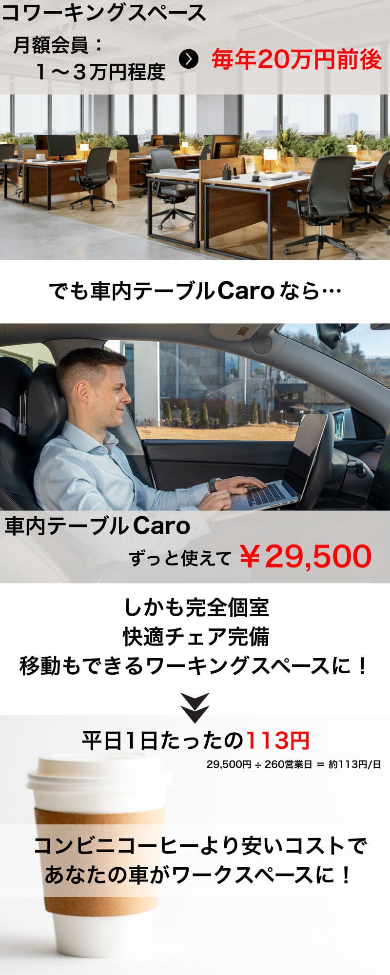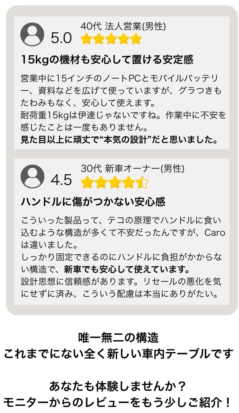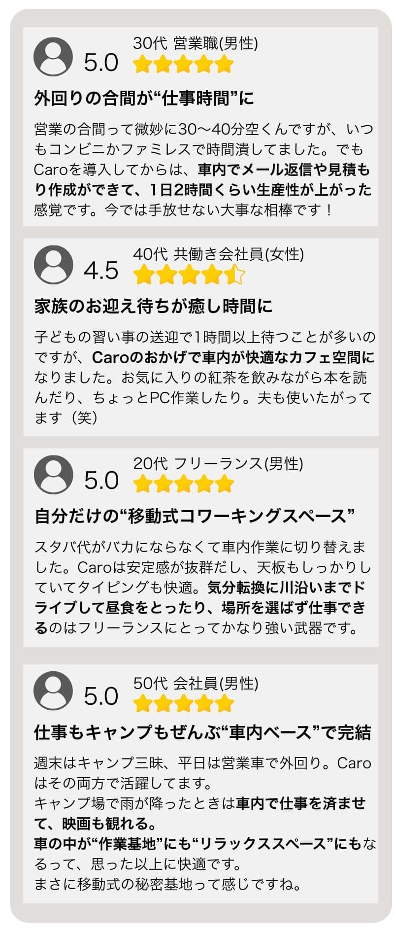 2025/09/30 20:00ここまで応援してくださった皆さま、本当にありがとうございます。おかげさまで多くの方にCaroを届けられることとなり、心から感謝しています。改めてお伝えしたいのは、Caroは“ただの車内テーブル”ではないということです。・近くの駐車場が、自分だけの静かな書斎に・カフェやコワーキングに通う必要がなく、年間数十万円の節約に・耐久性があり、一生モノのガジェットとして長く使える定価29,500円のCaroが、現在は 20%OFFの23,600円。さらに【最終日限定の5%OFFクーポン】を使えば、実質22,420円で手に入ります!1年260営業日で計算すると──平日1日わずか86円。カフェ代に消えていくお金とは違い、Caroは一度手に入れればずっと使えて、使うほどお得です。もし今回を逃してしまうと…・混雑したカフェを探して歩き回る・散らかった自宅や生活音の中で集中できない・車内でスマホをいじるだけの中途半端な時間そんな“もったいない日々”が、この先も続いてしまうかもしれません。Caroの再販予定はありません…つまり、このチャンスを逃せば二度と手に入らない可能性があります。未来の自分に後悔させないために──どうぞ、このラストチャンスを掴んでください。>> プロジェクトページはこちら【5%オフ】 もっと見る
