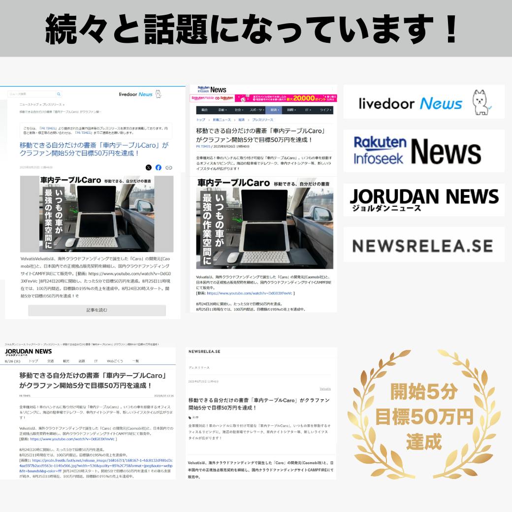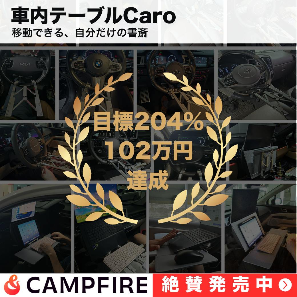 開始からわずか数日で、目標金額50万円を突破し、Caroはついに100万円を超えるご支援を頂きました!達成率にして204%。ここまで来られたのは、応援してくださった皆さま一人ひとりのおかげです。心から感謝申し上げます。今回のプロジェクトは、“生産性が低いと言われる日本の仕事環境を変えたい!”という想いで取り組んでいます。営業車での仕事中、子どもの送迎待ち、キャンプや旅行先でのひととき… 「ちょっとした時間を、もっと快適に使えたら」という気持ちに、多くの方が共感してくださり、こうして100万円を超えるご支援につながったのだと思います。 最初は小さな挑戦でしたが、皆さまの応援が重なり、想像以上に大きな広がりとなりました! これからも引き続き、ご支援頂いた皆さまに安心してお届けできるよう、準備を進めてまいります。 プロジェクトはまだ続きます。 「気になっているけど、まだ支援していない」という方も、ぜひこの機会に仲間になっていただければ嬉しいです(^^)皆さまと一緒に、新しい車内ライフスタイルを広げていけることを楽しみにしています。