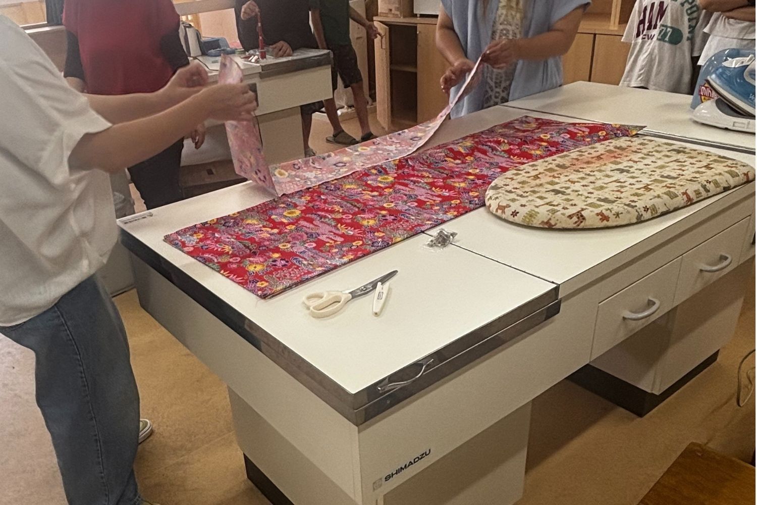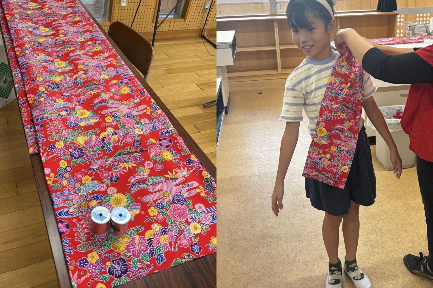 使用したのは、沖縄を象徴する鮮やかな紅型柄の布。赤を基調にしたデザインで、元気いっぱいの「赤道小らしさ」と沖縄の文化をアピールできるように選びました。