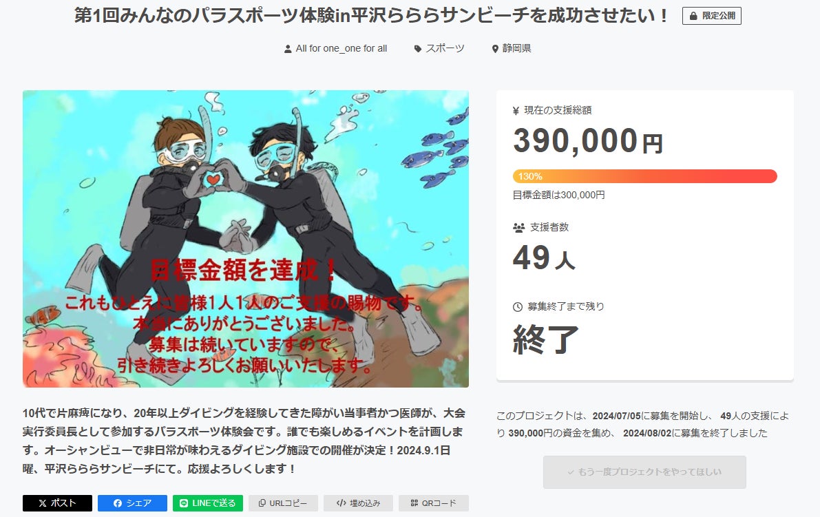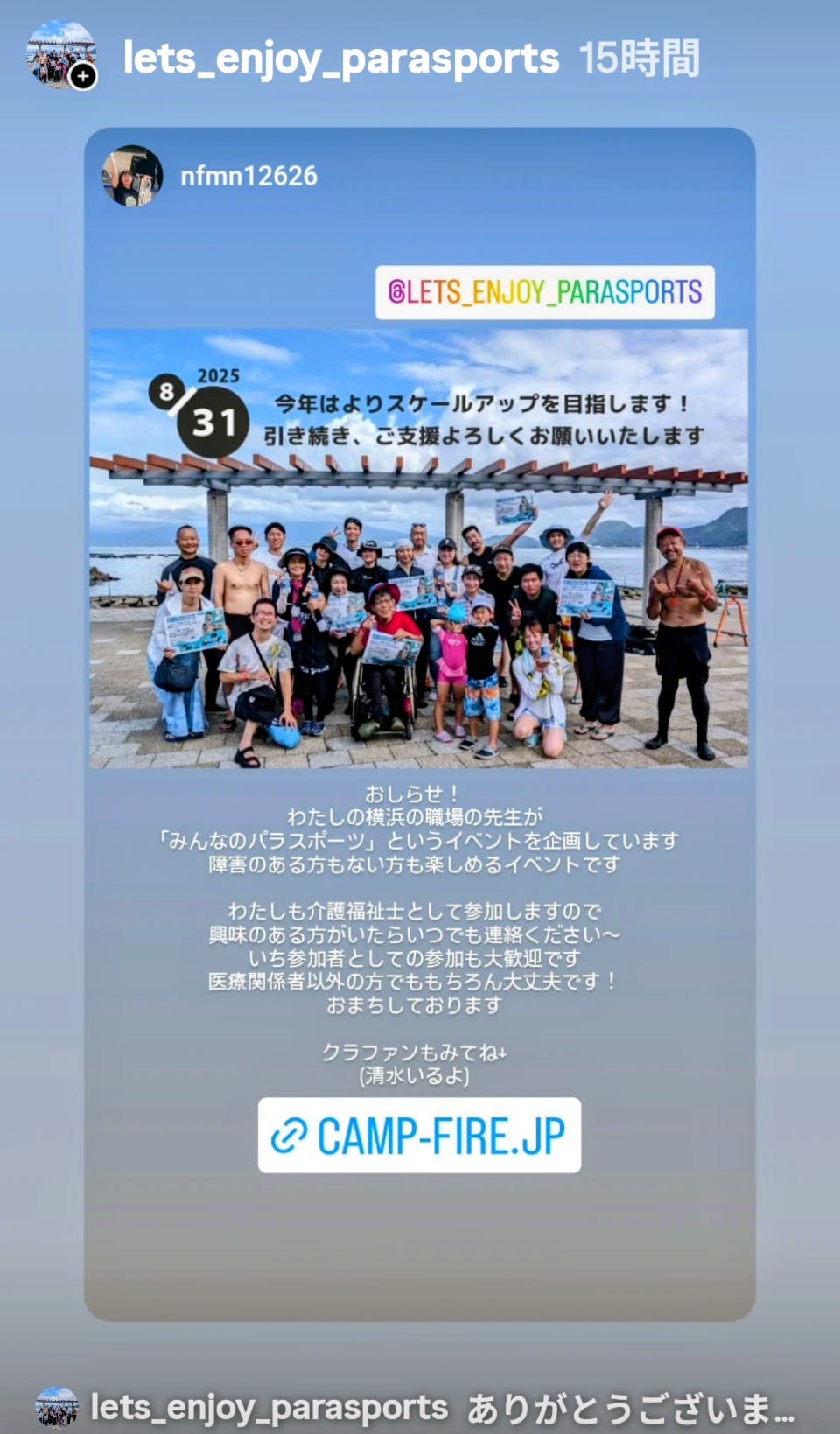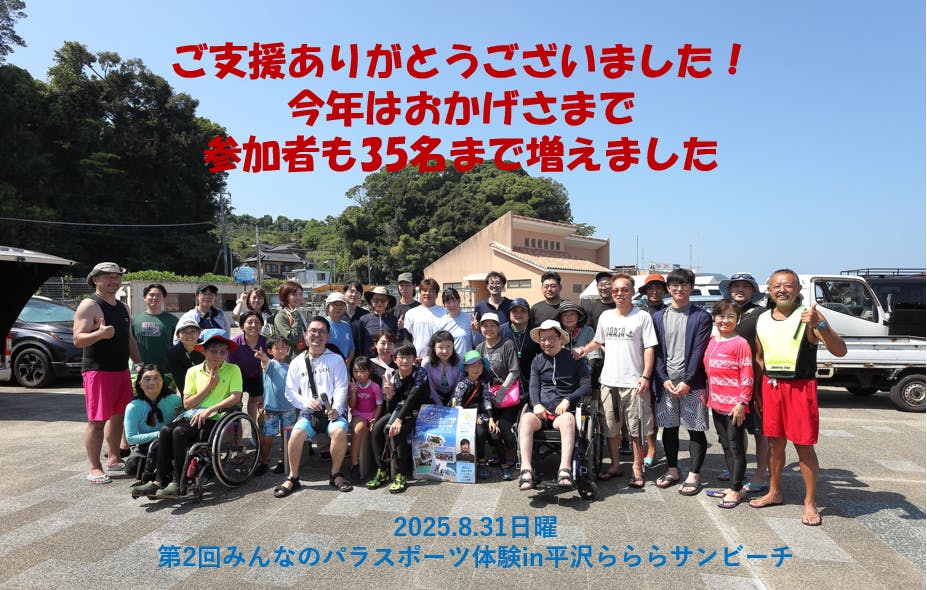 2025/09/03 07:09第2回みんなのパラスポーツ体験in平沢らららサンビーチ開催に際しましてご支援頂いた皆様、本当にありがとうございました。八月最後の日曜日に無事開催できましたことをご報告いたします。大幅に参加者も増え、子供から高齢者まで、障がいのあるなしに関わらず、一様に楽しかったと大好評なイベントとなりました。脳梗塞後砂浜を歩くことが夢だった方の、夢の実現にも立ち会うことができました。また、吉本興業・パラスポーツ芸人であるイダリアンさんにも昼にネタを披露して頂き、子供たちがゲラゲラと笑っていう様を見て、運営している私たちまで幸せになりました。皆様からの支援があってのイベントです。まずは取り急ぎ御礼申し上げます。報告書の作成にも、これから取り掛かっていく所存です。大会実行委員長 古賀信太朗 拝 もっと見る