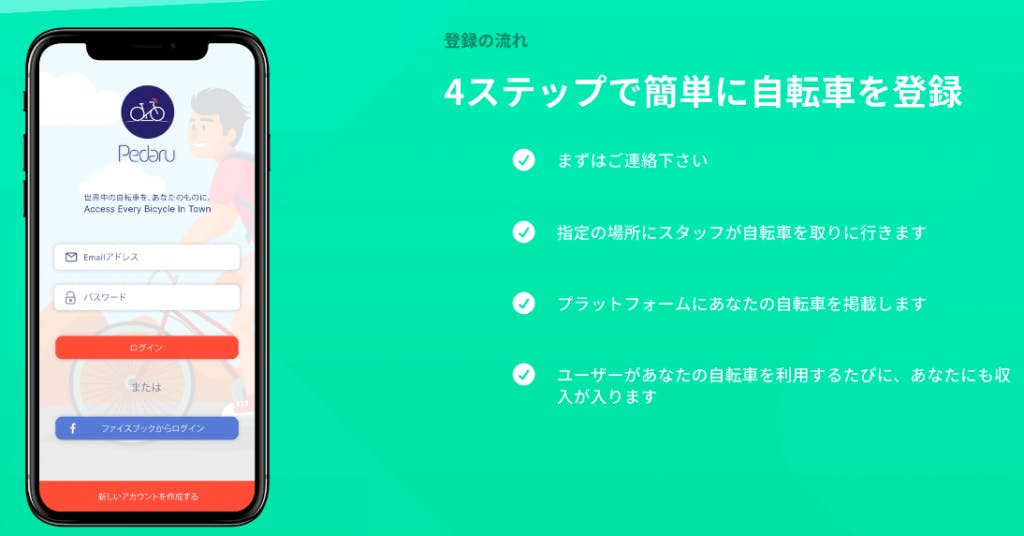 ②サービスの登録はこちらから:http://pedaru.com/ja/bicycle-users/