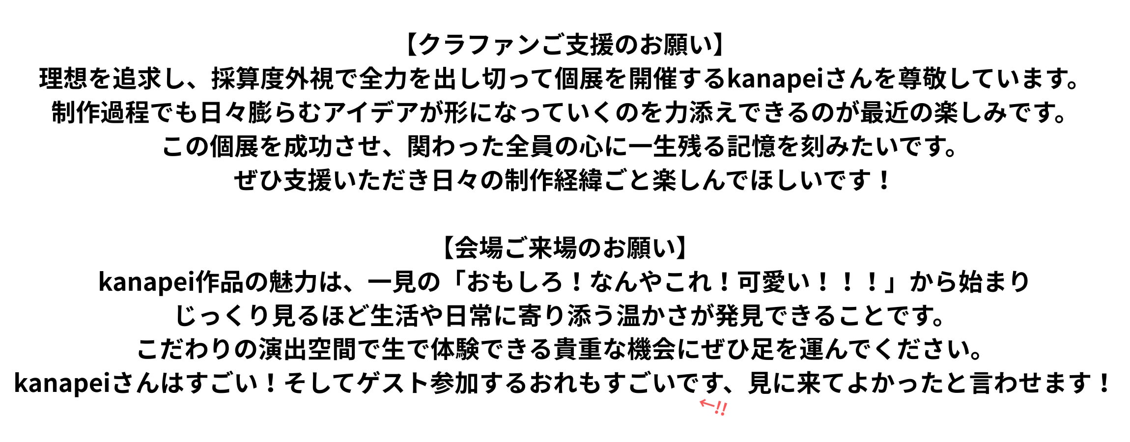 だから今回は「助けてください」というクラウドファンディングではなく、一緒に楽しんでくれる人、一緒に個展を成功させたいと思ってくれる人と共に盛り上がっていくためのプロジェクトだと思って、この先もお付き合いいただけると嬉しいです。