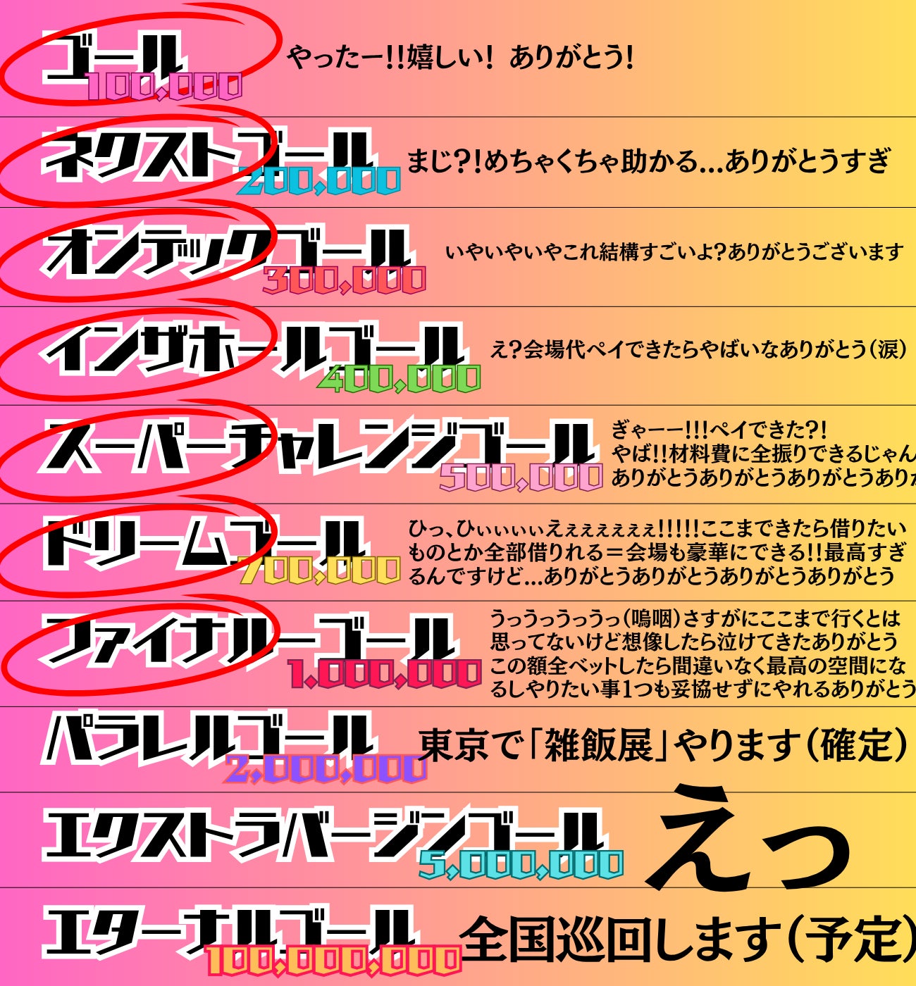 そんな気持ちから、雑飯展の東京進出も含めた10のゴール設定としました。正直、後半の方はあまりちゃんと考えてませんが、金額が集まれば何でもできる!逆に何しようか!をみんなで考えていくのも楽しいかなと思っています。もしかしたら世界進出も...oh...なんて、ワクワクしてながら応援して頂ければ嬉しいです!!