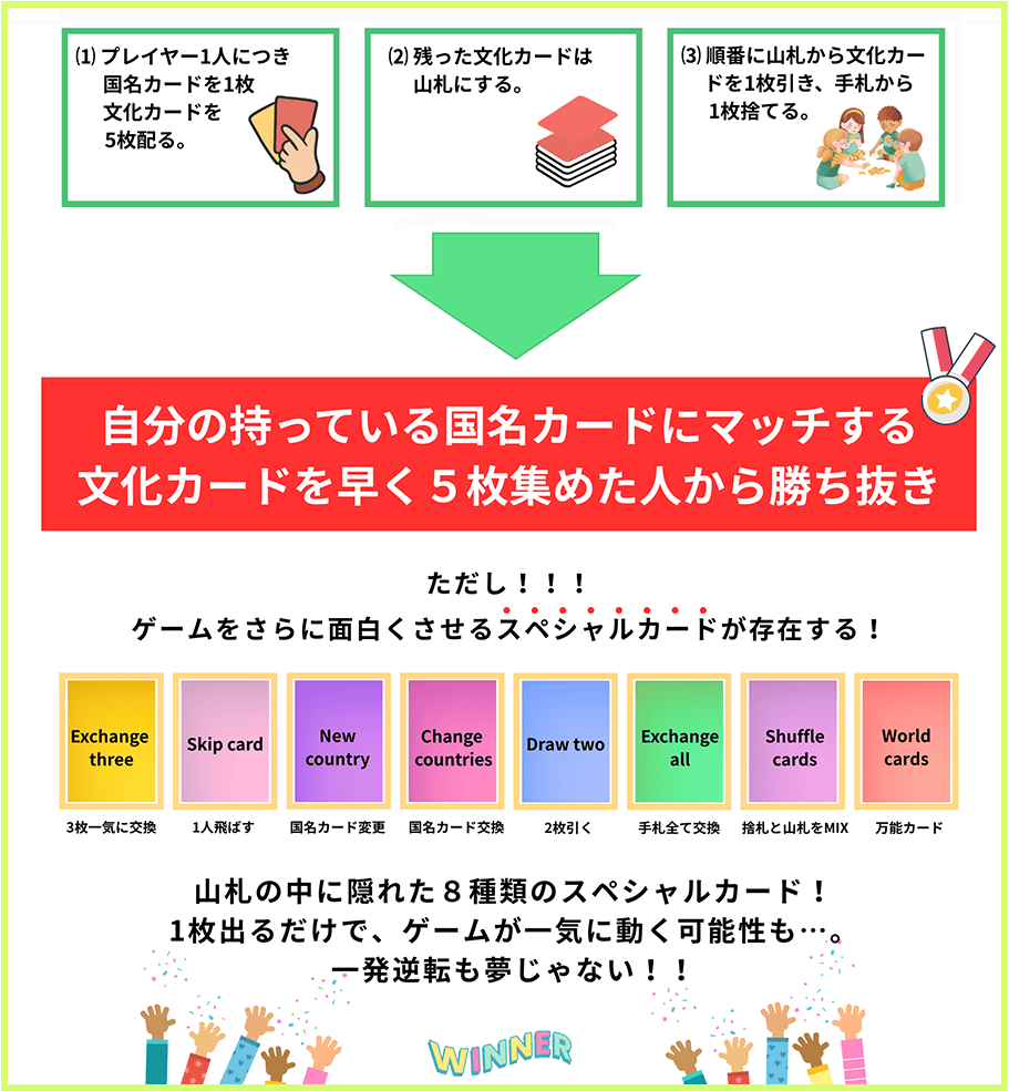 自分が担当になった国の文化カードを5枚集められれば勝ち!