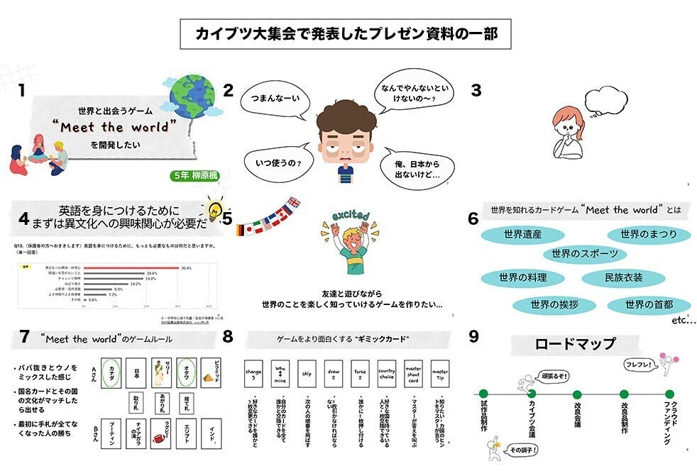 カードゲームを作るのにいくらかかるのか、その時はまだ全然分かっていなかったけれど、とにかくカイブツ大集会に出て、少しでも応援してもらえたらな嬉しいなと思って応募をしました。このような発表は初めてだったので、お母さんに相談にのってもらいながらプレゼンのスライドを一生懸命作りました。どう書いたら、どう話したら、わたしの気持ちがより伝わるのかをいっぱい考えました。