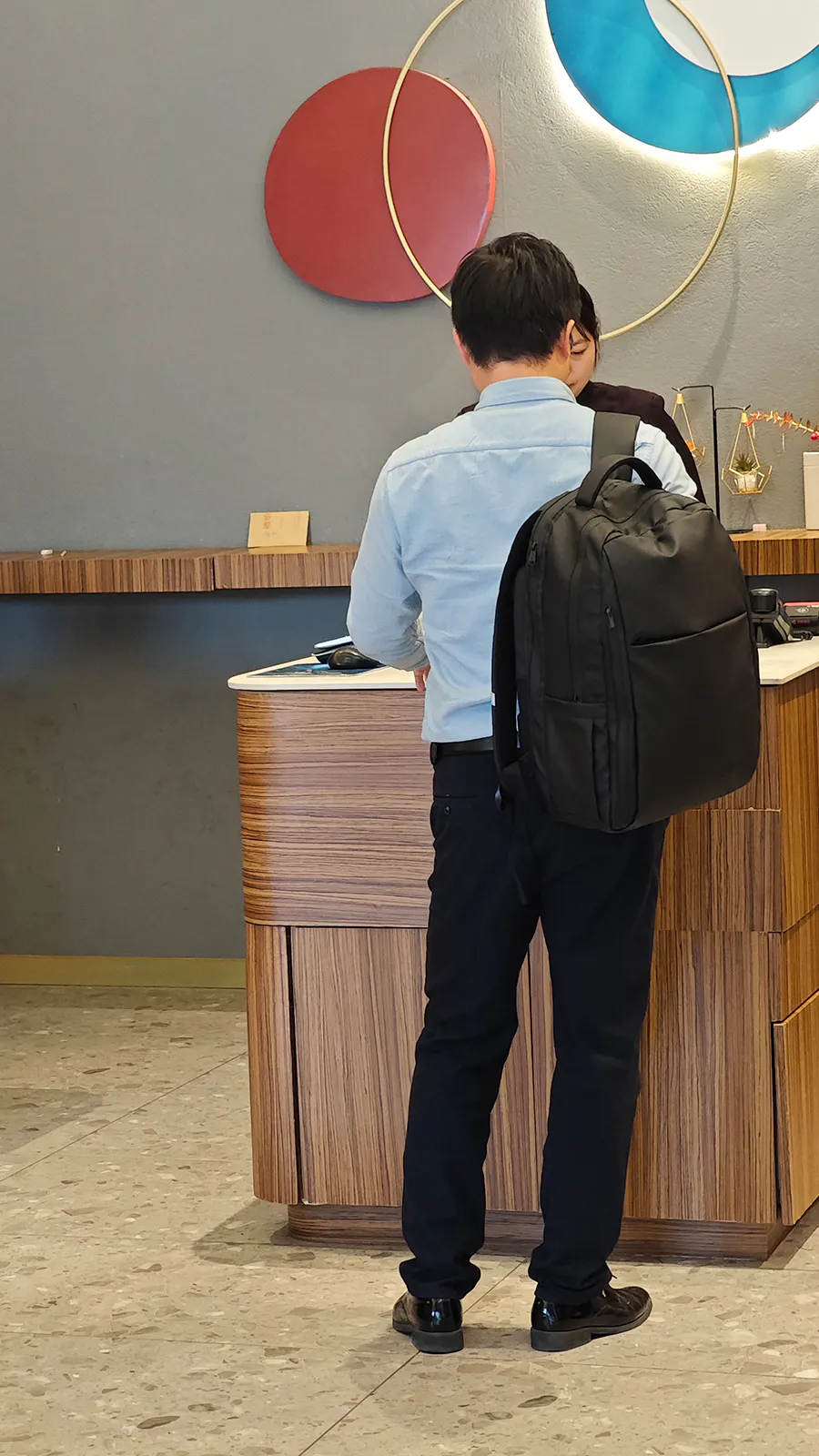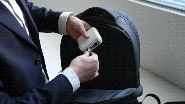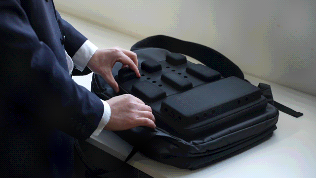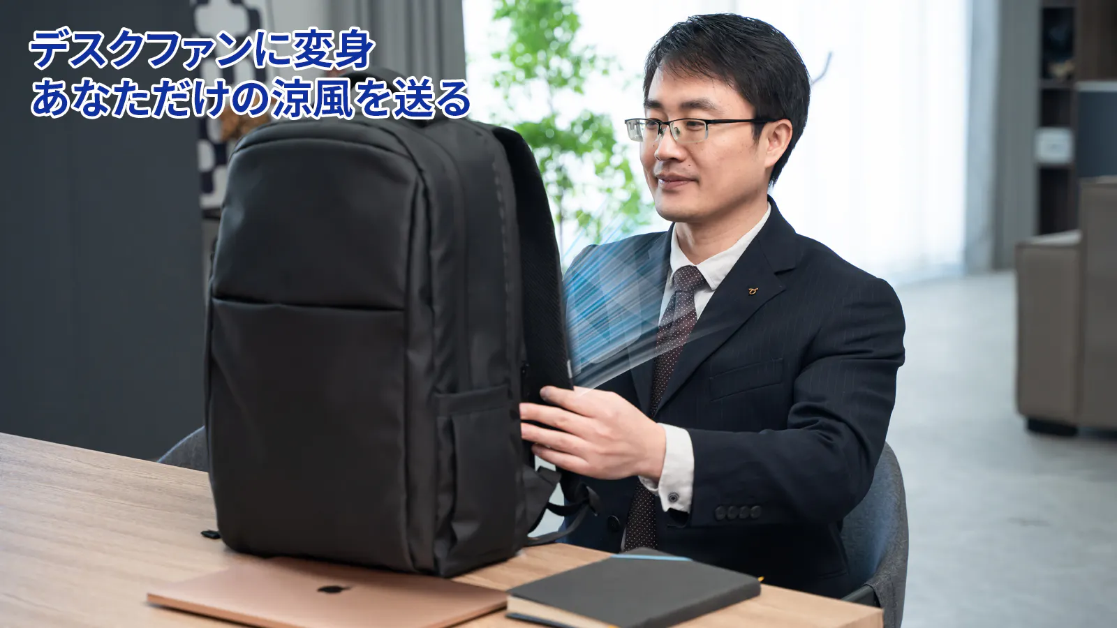 会社に到着後クールリュックがデスクファンに早変わり、移動から来る蒸し暑さや嫌な気持ちを軽減し、よりスムーズに仕事モードに切り替えるお手助けをします。