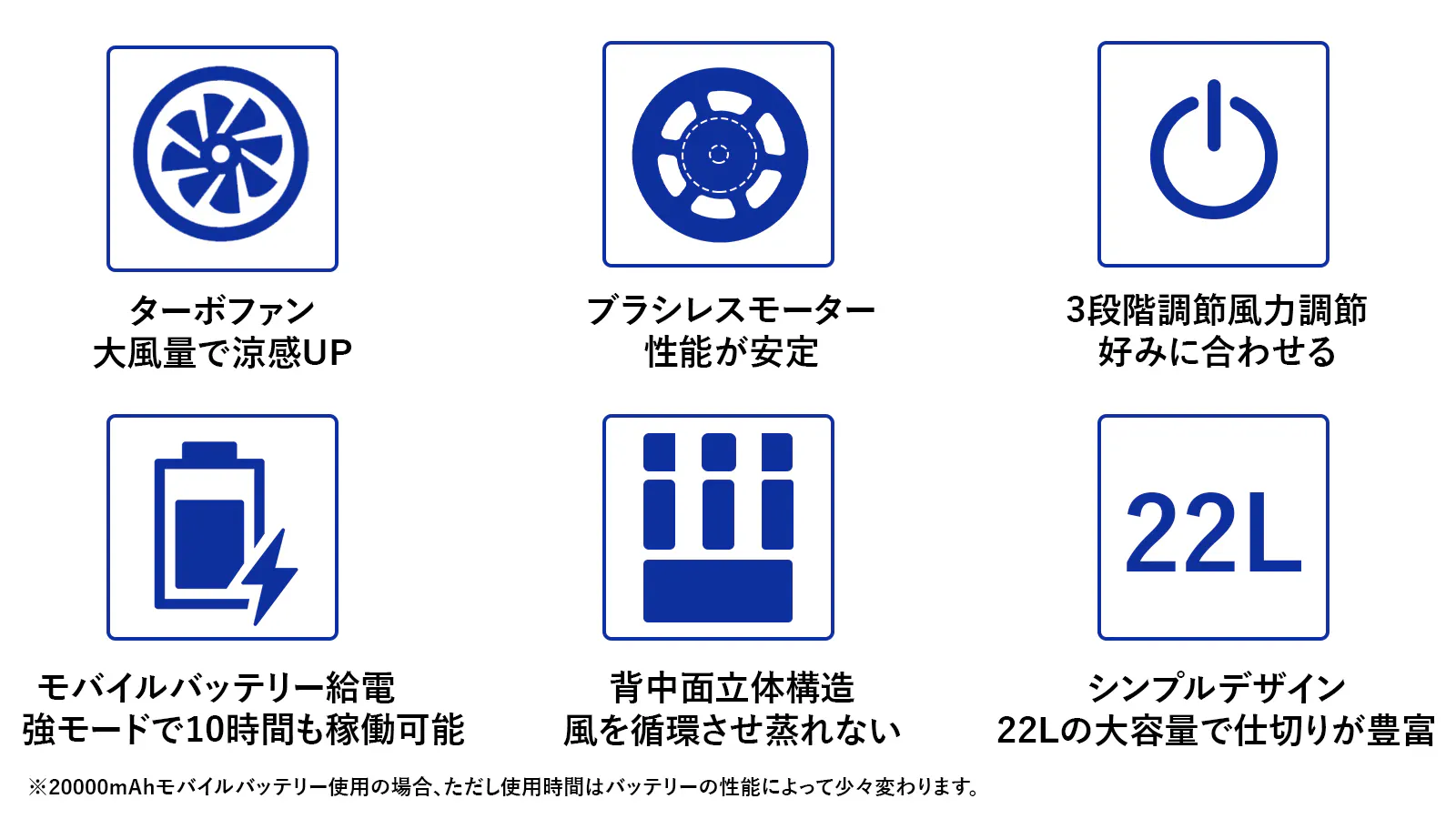 「買ったリュックやベストにファンが付いているが、あまり風が感じられない」という消費者の声が多いです!それを解決するため、今回の新作リュックに高性能ターボファンを搭載させ、持続の大風量が涼しさの秘訣です。