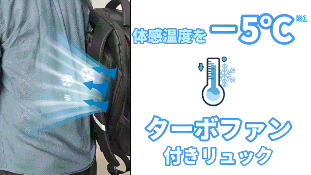 ※1:室温30℃にて実験を5回行い、クールリュックを使用後、被験者の体感温度を平均的に5.06℃下げたというデータが取れました。なお体感温度に個人差があります。