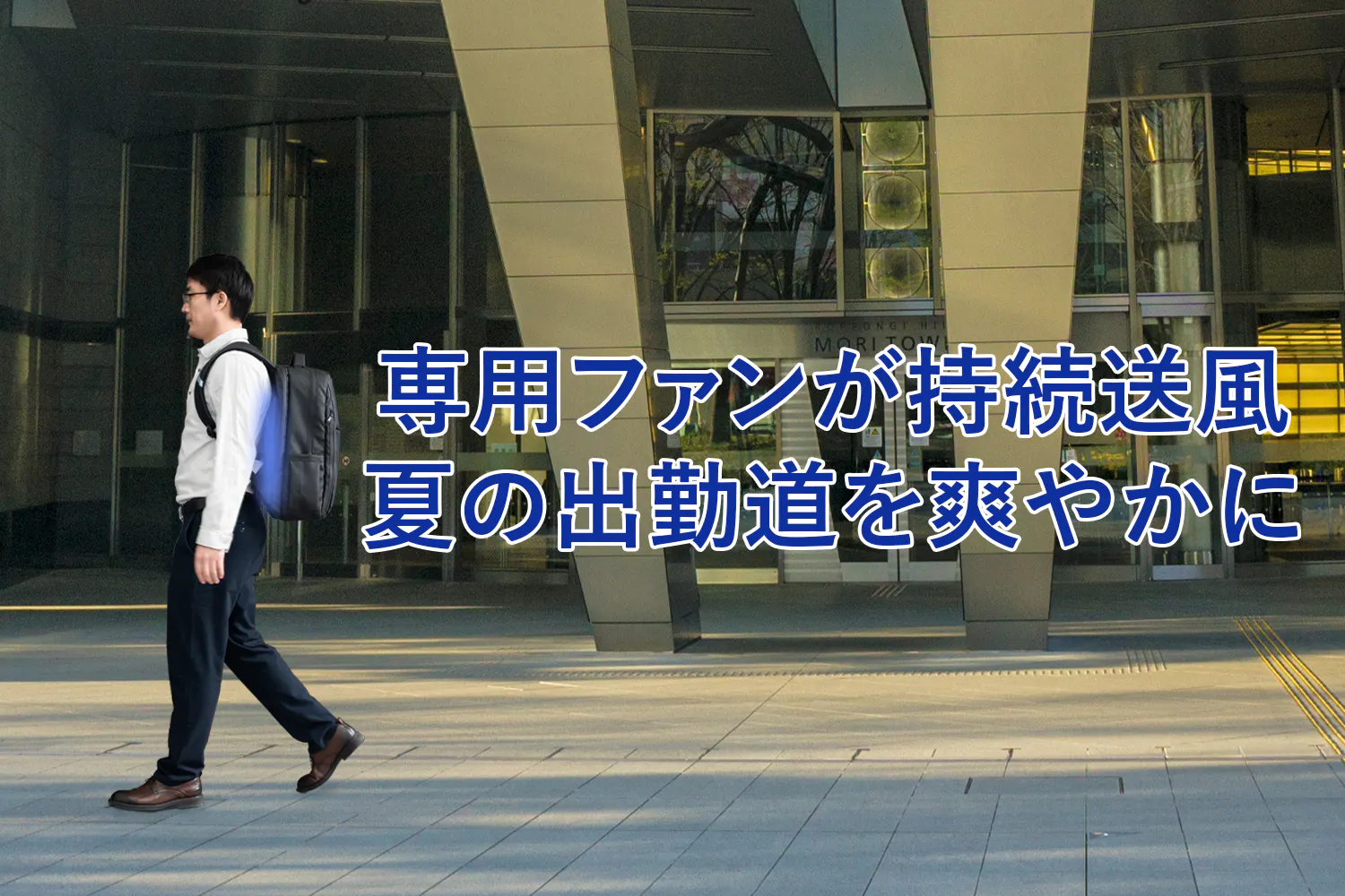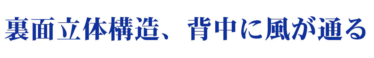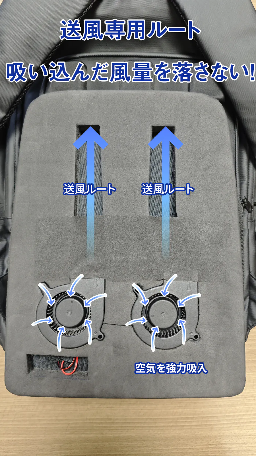 ファンが優秀でも、リュックの裏面が背中に密着してしまうと、空気が上手く通りません。体との間にしっかりスペースを空けることによって風の通しを良くします。専用の送風ルートで吸い込まれた風をその威力を落さずに背中に送り続けます。