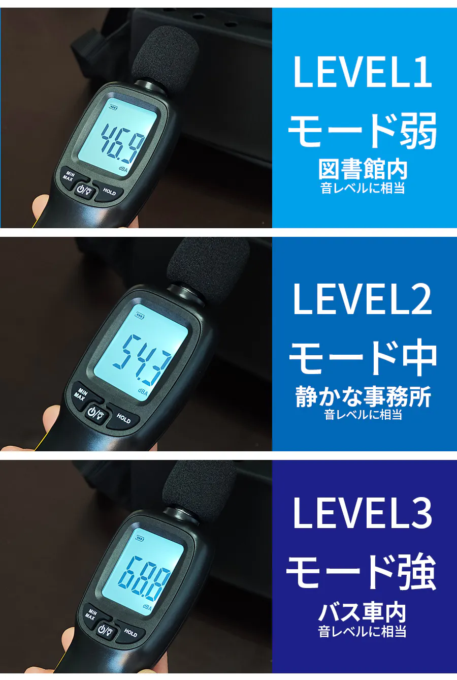 モード強、中、弱での騒音レベルがそれぞれ図書館内、静かな事務所、バス車内に相当するものでした。交通機関での移動中も音を気にせずに気持ちよい風が楽しめます。