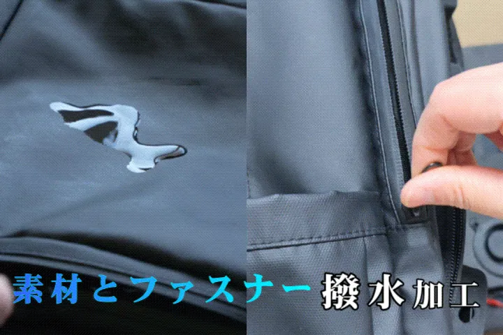 リュックの生地だけではなく、ファスナーにも撥水加工を施し、リュック全体に生活レベルの防水機能があります。出勤途中のいきなり雨に対応します。