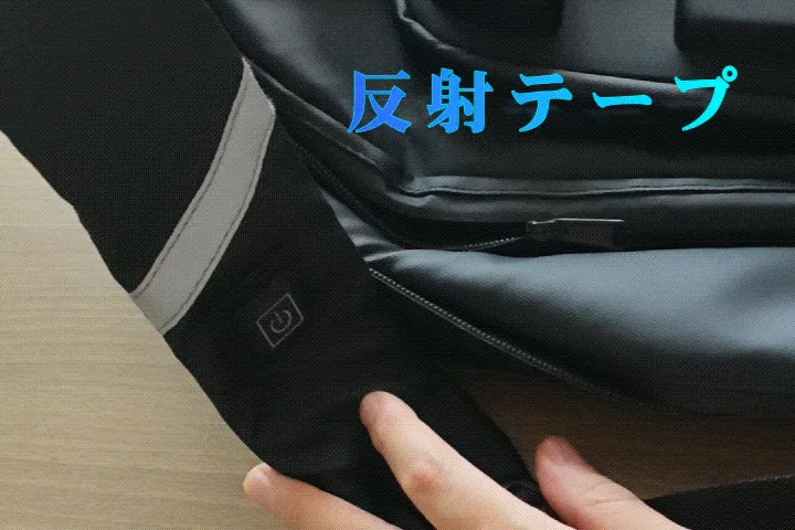 リュックのベルトに反射テープが縫製されています。夜間の走行時、向こうから来る光を反射し、相手に自分の存在をアピールして、安全を守リます。