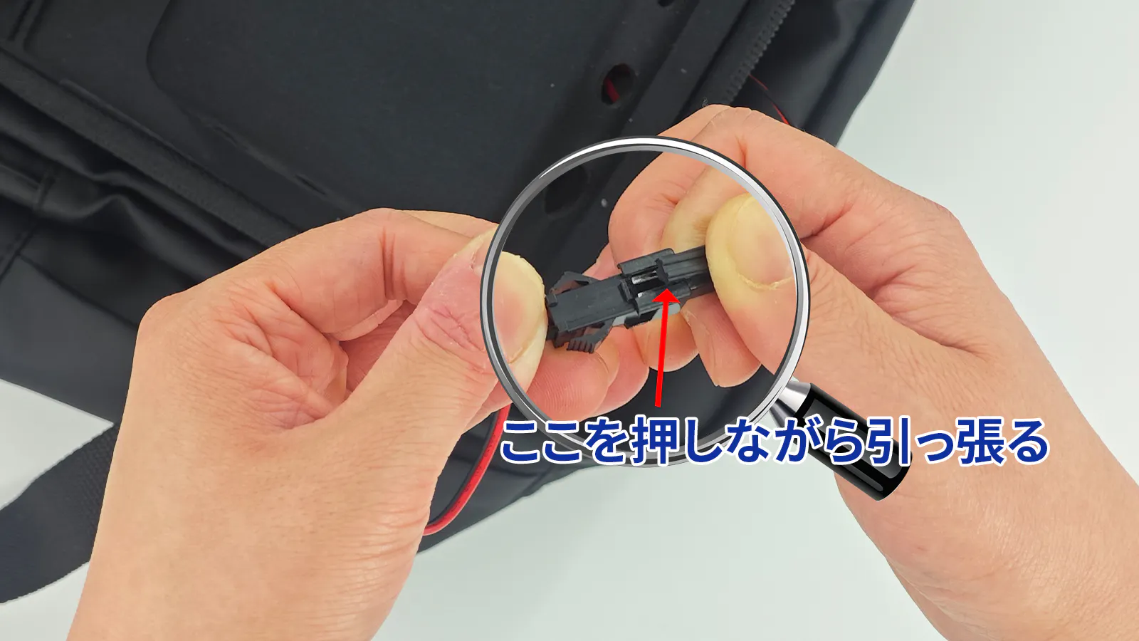 電源の接続:リュックのUSBケーブル( Type-A)をお手持ちのモバイルバッテリー(出力が5V-2A以上のもの)に接続するだけです。