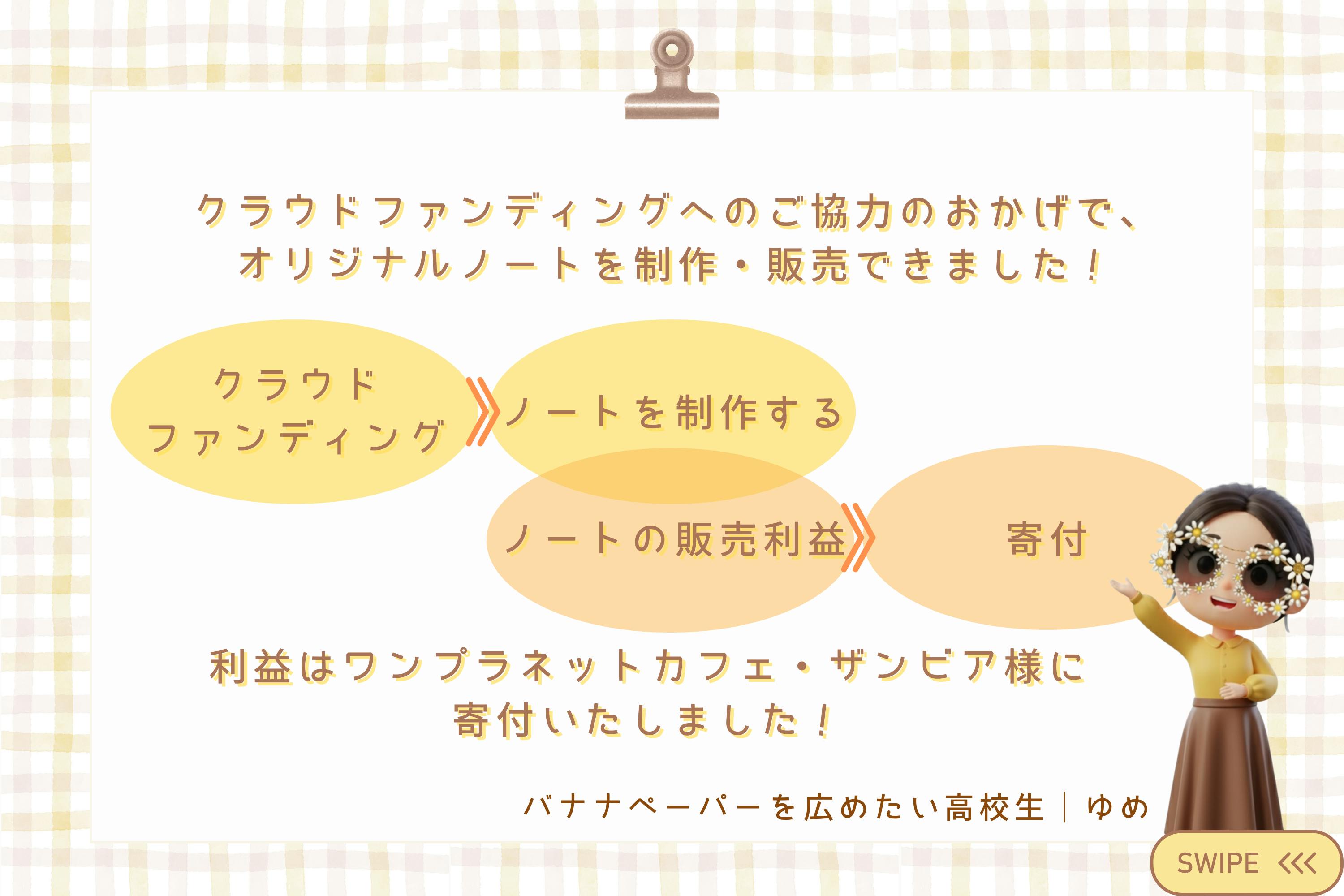 2026/02/16 08:00クラウドファンディングへのご協力のおかげで、オリジナルバナナペーパーノートを制作・販売できました。販売していた、オリジナルバナナペーパーノートの利益を先日、ワンプラネットカフェ・ザンビア様に寄付いたしました。寄付金額は、"165,960円"です!寄付金の使い道については、「現地のチームリーダーにPCトレーニングを受けてもらい、エクセルが使えるようになること」を目指しているそうです!これにより日本側と在庫データや出退勤管理のスムーズな共有が可能になると期待されます!寄付金がバナナペーパーの普及や今後のザンビアの発展のひとつに繋がるように使っていただけることを、大変嬉しく思います。クラウドファンディング・制作・販売にご協力いただいた皆さま、支えてくださった皆さま、ノートご購入いただいた皆さまに感謝申し上げます。 もっと見る