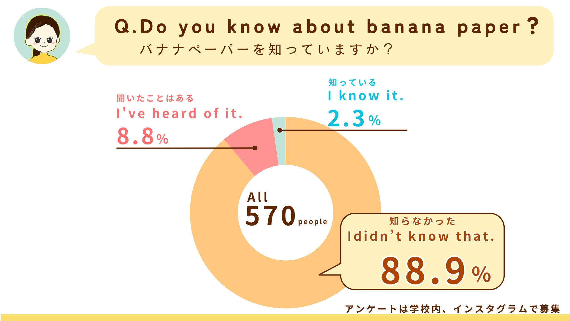 570人中で88.9%もの人がバナナペーパーを知らない(聞いたことがなかった)ことが分かりました。