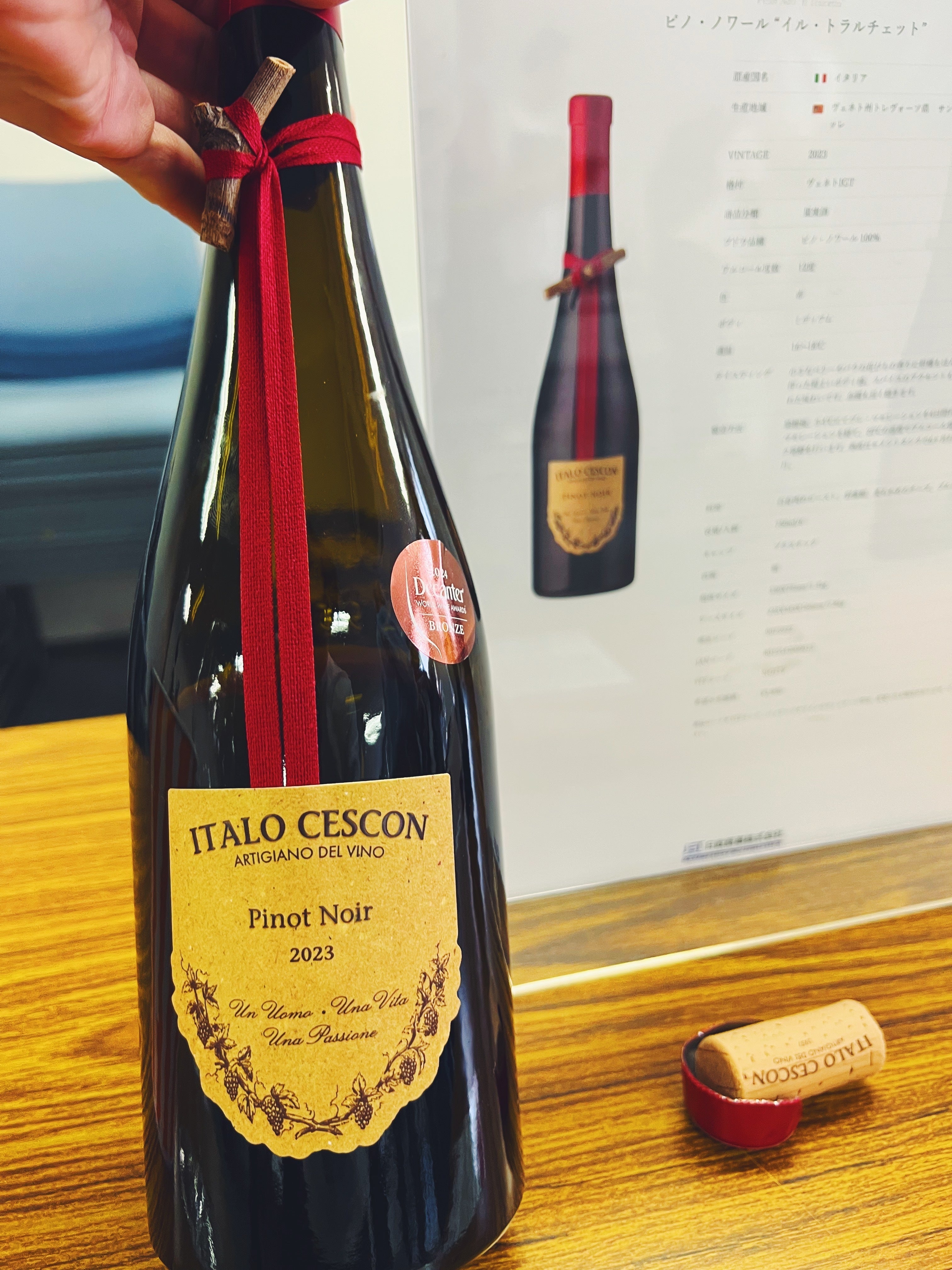 広島で行われた、日欧商事様のワインの業務試飲会に参加してきました!沢山のワインの中で、特に印象に残ったのが、イタロ・チェスコンという生産者のピノ・ネーロ(ピノ・ノワール)です。イタロ・チェスコンは、北イタリア、ヴェネト州トレヴィーゾ市近郊で1957年に設立された家族経営のワイナリー。ボトルの首にブドウの小枝が結び付けてあるのがトレードマークで、これは現オーナーのおばあさま・アンナさんのアイデアなんだそうです。「自然を敬いながら、地域の文化と調和したワインを造る」という想いのもと、今も家族で丁寧なワイン造りを続けておられます。もともとこの造り手のソーヴィニヨン・ブランは好きで使っていましたが、赤を飲むのは今回が初めて。しなやかで上品な味わいで、でも奥深く、業者さまのご説明も聞きながら「これは自分の料理に合わせてみたい!」と強く思いました。その場で、お店で扱うことを決定しました。TAVERNA TAKIのオープン後には、ぜひ皆さまにも味わっていただきたい一本です。どうぞ楽しみにしていてください!^_^