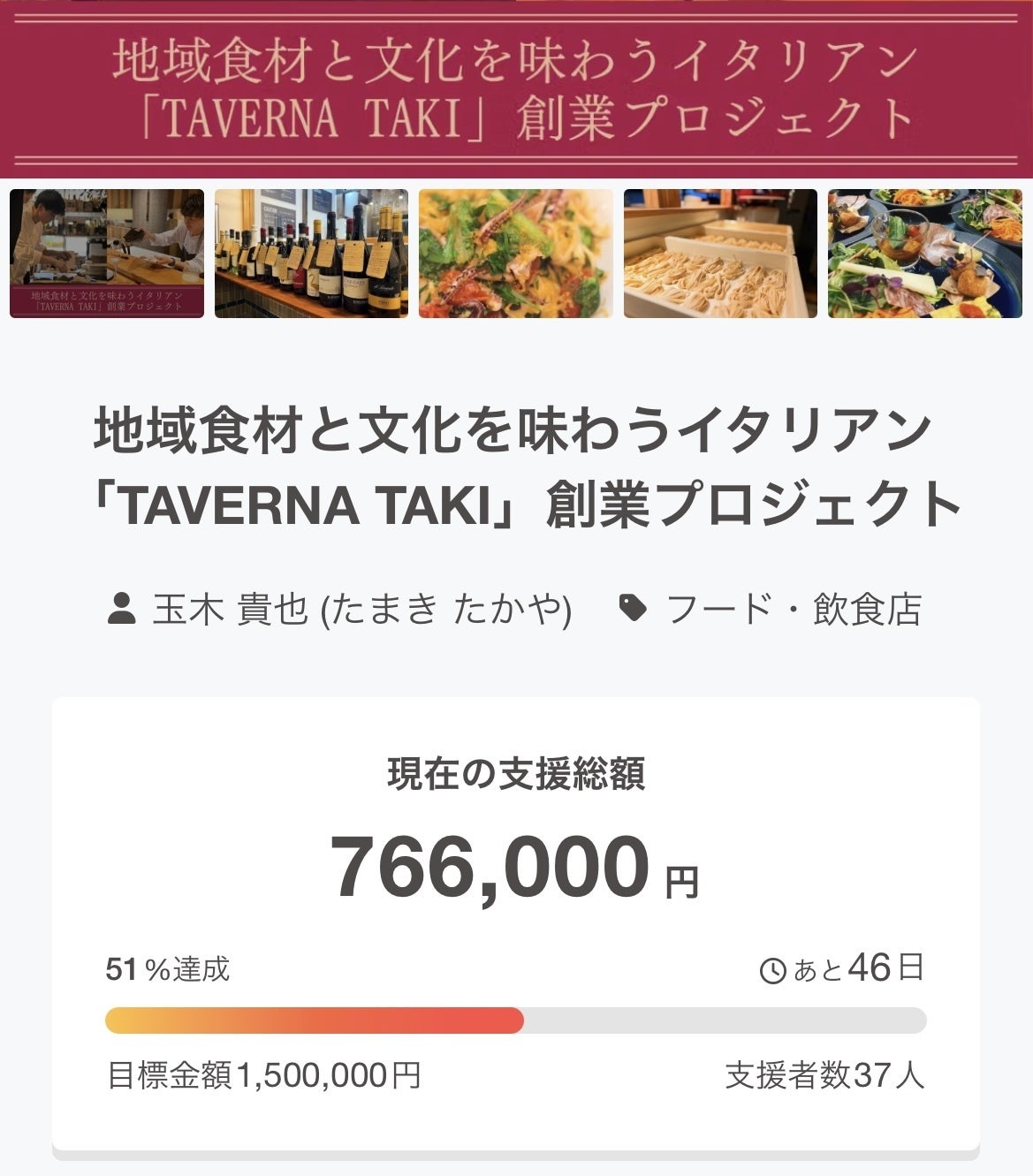 プロジェクト公開となりました。早速ご支援をいただき、本当にありがとうございます!!なんと、10月1日20:00時点で、PC版トップページの人気ランキング「フード・飲食店」カテゴリーで 3位 にランクインしました。これはひとえに、皆さまの温かい応援のおかげです。心から感謝しております。まだスタートしたばかりですが、この勢いのまま、より多くの方に知っていただけるよう全力で頑張っていきます!これからの活動も、どうぞ応援よろしくお願いします。TAVERNA TAKI玉木 貴也