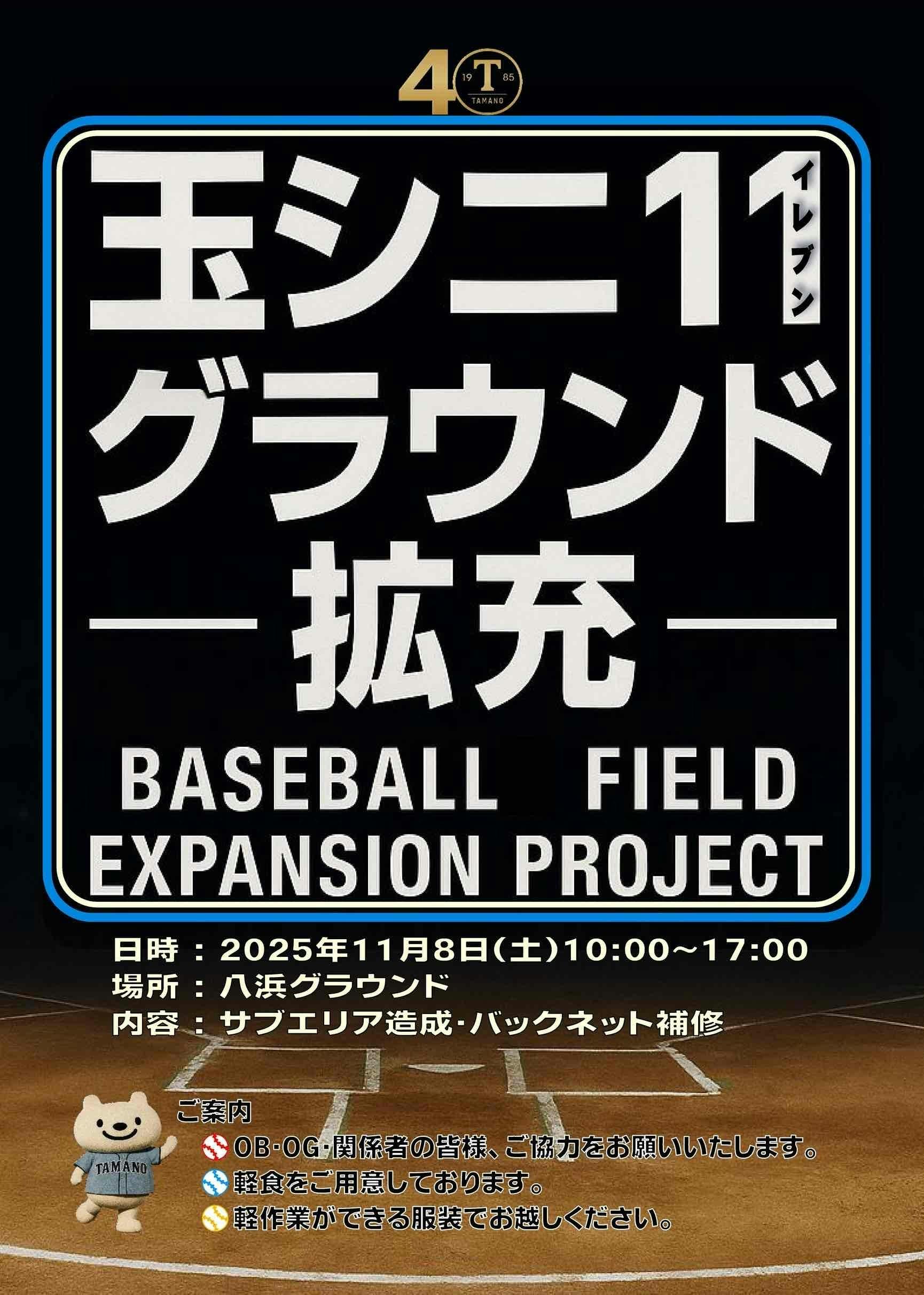 2025/10/24 21:00玉シニ40周年クラファンの目標に掲げておりました”グラウンド拡充”ですが、11/8(土)に実施する事となりました。まずはこの度の皆さまの温かいご支援によって、”グランド拡充”が図れます事、改めまして心よりお礼申し上げます。また、チーム内で相談の結果、”グランド拡充”は今年限りの取組みとせず、毎年11月の恒例イベントとして継続的に取組む事と致しました。その名も「玉シニ11(イレブン)」!!ベタなネーミングですが、、、より安全安心、より効率的な野球環境の拡充を図ると共に、OB・OGはじめチームを支えて下さる関係者の皆さまとの交流の場とさせて頂きたいと考えております。つきましては、今年の取組みを下記のとおりご案内致しますので、OB・OGはじめチームを支えて下さる関係者の皆さまのご参加をお願い申し上げますm(__)mグラウンド拡充で良い汗をかきながら、昔話に花を咲かせ、また現役チームへの叱咤激励もお願い致します。【玉シニ11(イレブン)グランド拡充2025】のご案内日時:2025/11/8(土)10時~17時頃場所:八浜グラウンド内容:左中間奥にサブエリアの造成、バックネットの補修 ※軽食等ご用意してお待ちしております ※申込み不要(途中参加、抜け等、ご自由に出入り下さい) ※八浜グラウンドへのアクセスについては、公式HP等、下記ご参照下さい公式HP:玉野リトルシニア 公式INSTAGRAM:玉野リトルシニア(@tamano_little_seniors_official) • Instagram写真と動画FACE BOOK:玉野リトルシニア | Tamano-shi Kagawa | Facebook もっと見る