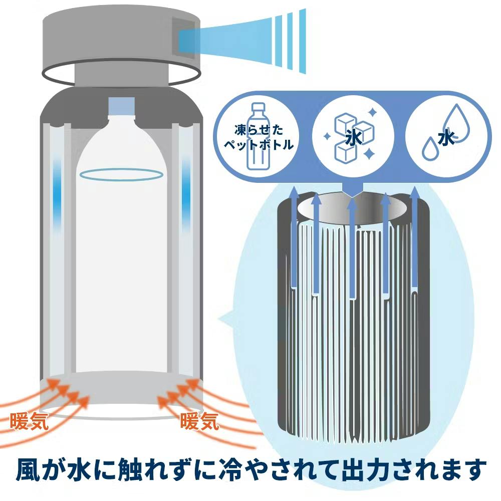 凍ったペットボトルを入れて水で浸すと-7度に冷やされた冷風がでる