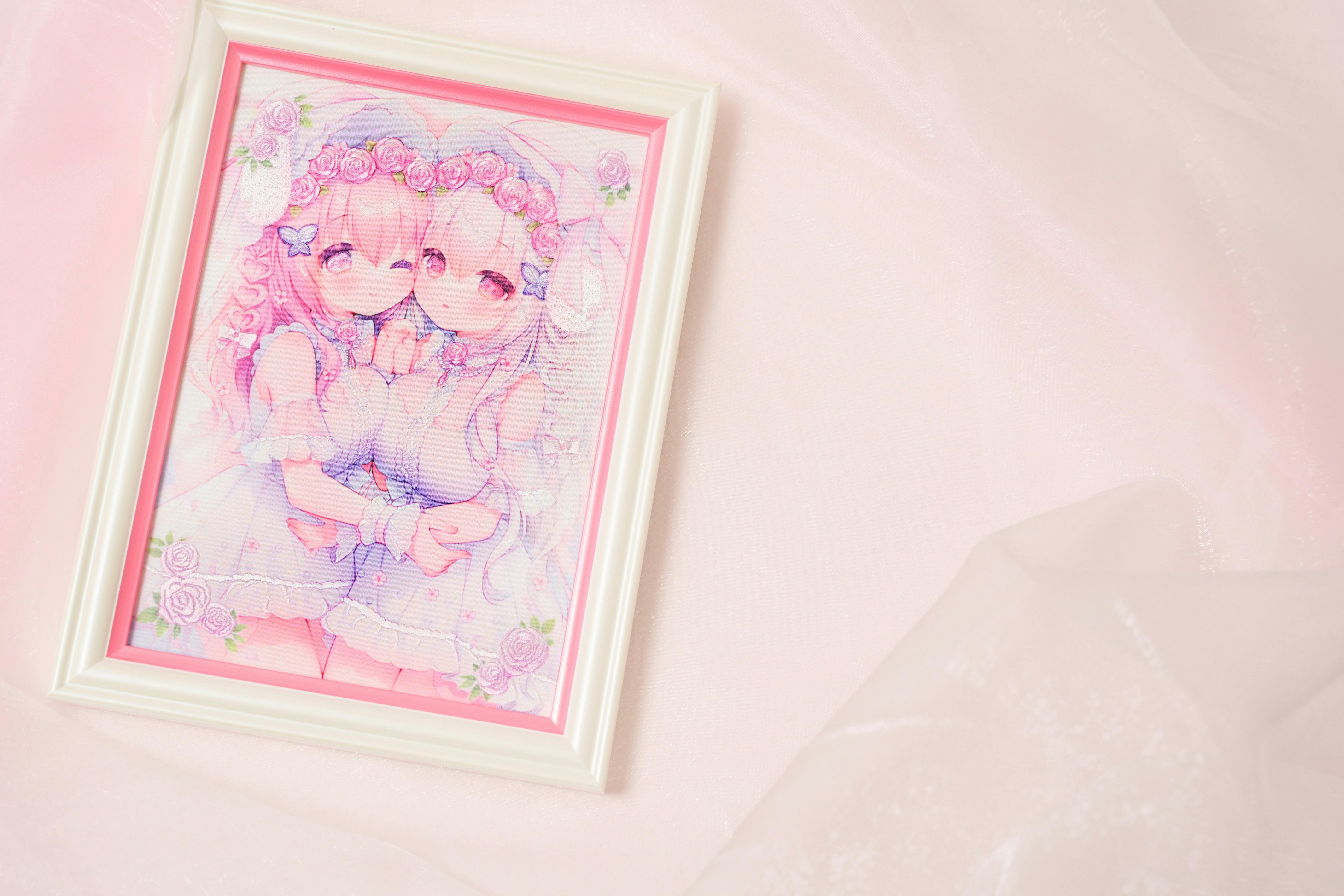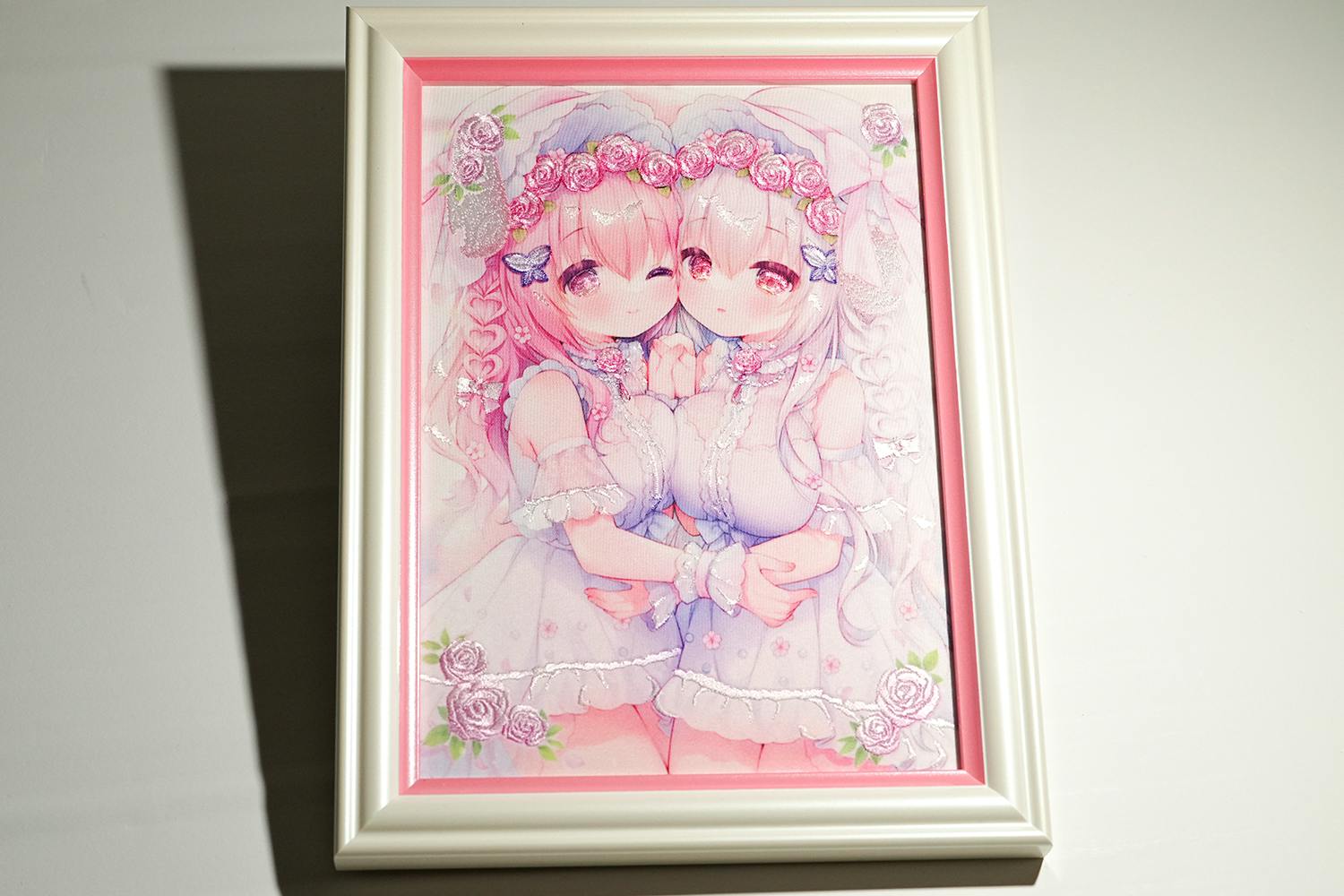 イラストを引き立たせるホワイトパールカラーとピンクの差し色が美しい額装に入れてお届けします。