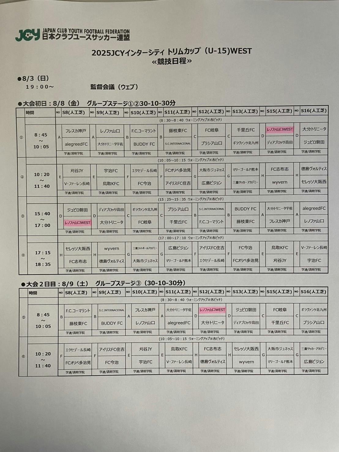 8月8日(金) JCYインターシティ トリムカップU-15(西日本大会)