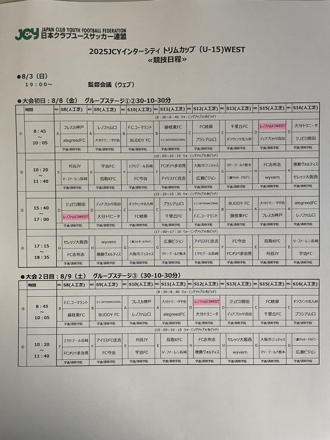 8月8日(金) JCYインターシティ トリムカップU-15(西日本大会)