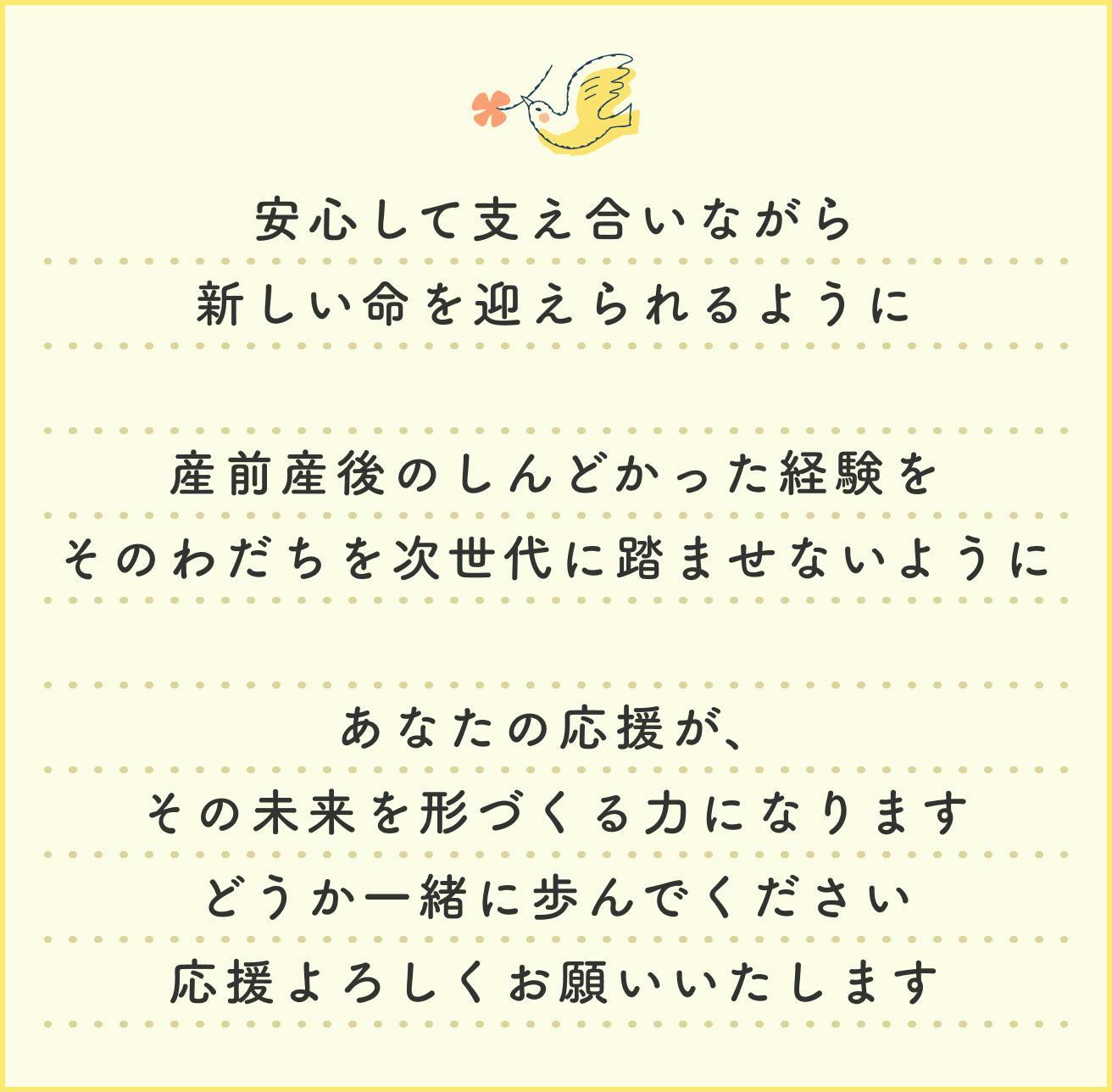 産前産後の孤独やすれ違いを減らし、自分らしく家族を想像することのできる社会を作ることは、次世代への大きな贈り物です。