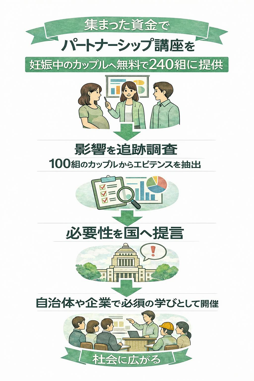 だからこそ私たちは、「パートナーシップ講座」を、自治体や企業の中で、出産を控えた家庭が当たり前に受けられる学びとして位置づけていきたいと考えています。
