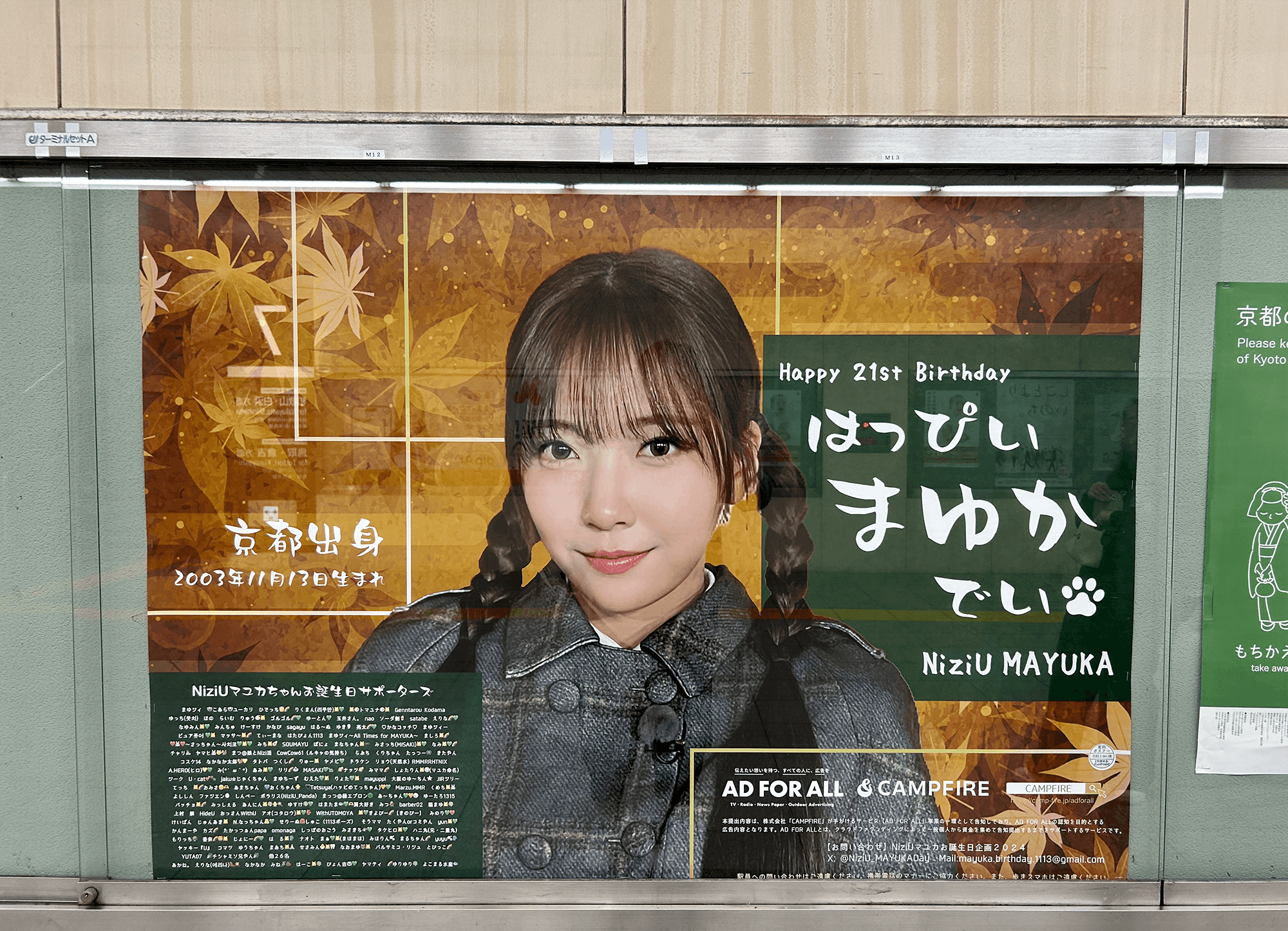 ※応援広告・誕生日広告は、アイドルや歌手の誕生日/記念日をファンが盛大にお祝いするという韓国から始まった文化です。現在では日本のアイドルグループやアニメキャラクターなどの記念日を、駅広告ポスターやビジョン、カフェコラボイベント等でお祝いする文化が日本でも広まっています。