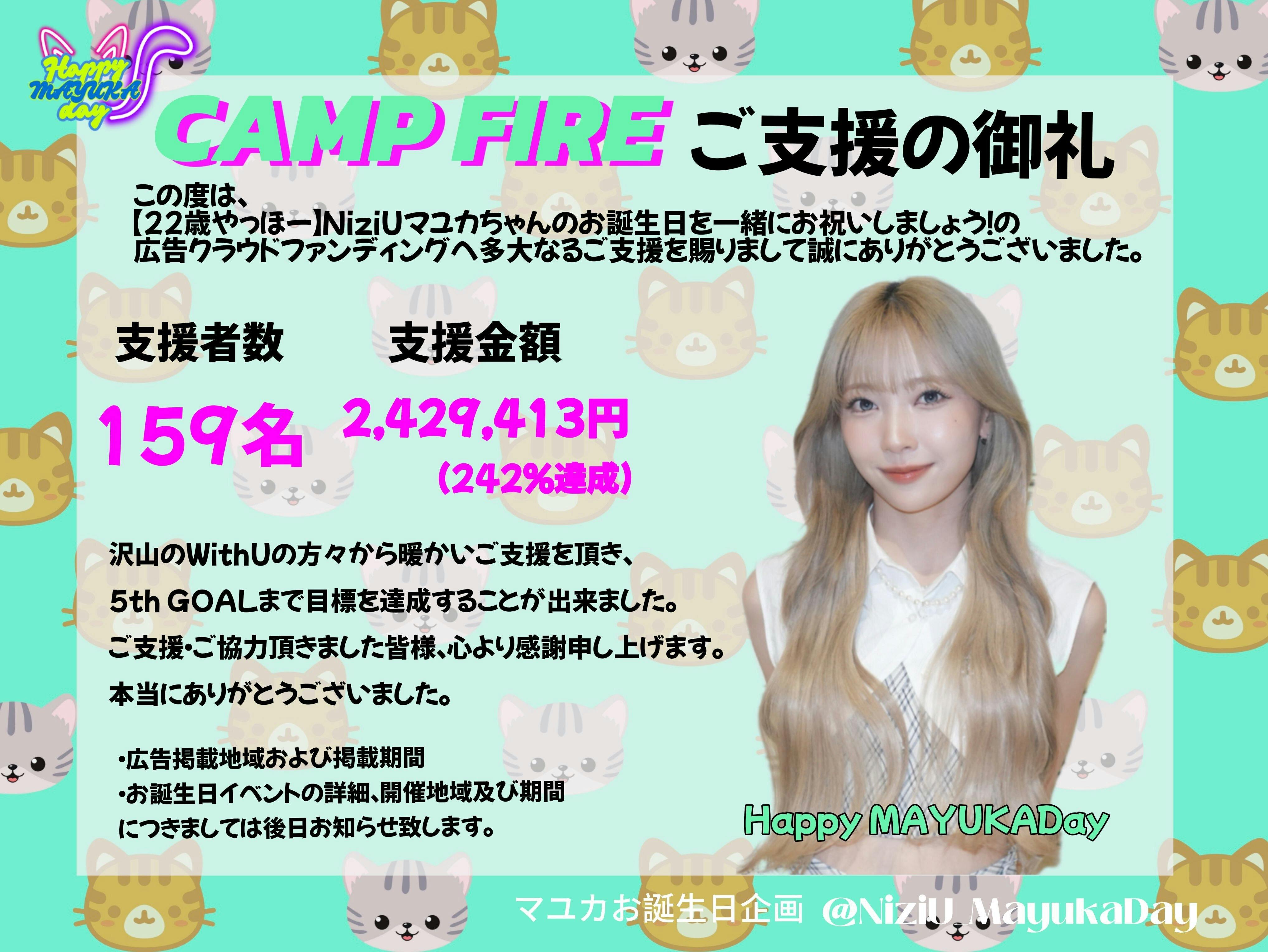 2025/09/09 18:00【ご支援の御礼】 この度は「【22歳やっほー】NiziUマユカちゃんのお誕生日を一緒にお祝いしましょう!」広告クラウドファンディングにご支援いただきまして誠にありがとうございました。159名の方の厚いご支援とご協力のおかげで支援金額が2,429,413円(242%)に達成し、9/8(月)をもちましてクラウドファンディング募集期間を終了いたしました。ご支援・ご協力、誠にありがとうございました。掲載地域の追加やイベント情報は詳細が決定しましたらまたご連絡いたします。9/9(火)本日20:00より、X当アカウントにてオンライン企画第1弾がスタートいたしますのでぜひ下記リンクからご参加いただけましたら幸いです。https://x.com/NiziU_MayukaDay引き続きよろしくお願いいたします。NiziUマユカお誕生日企画 もっと見る