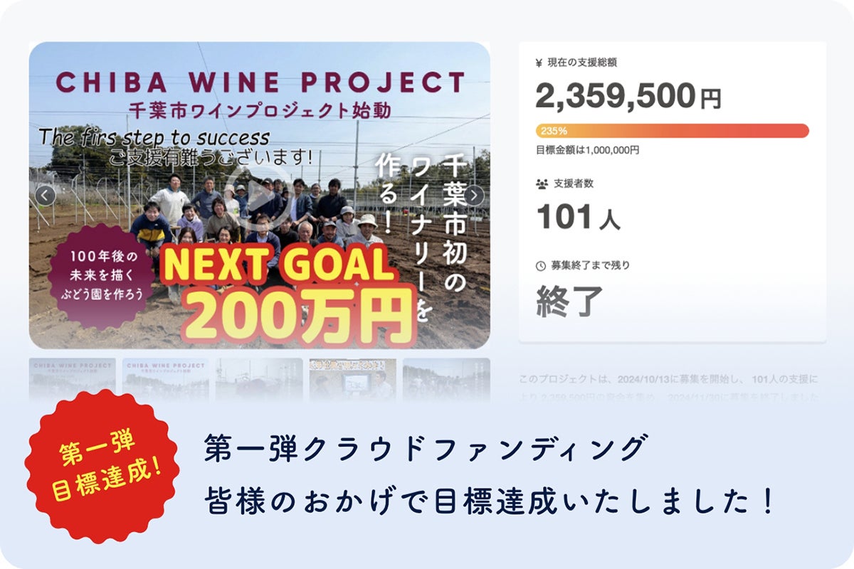 昨年、皆様からいただいた温かいご支援の光に導かれ、私たちは千葉市初のワイナリー設立という大きな夢への第一歩を踏み出すことができました。第一弾クラウドファンディングの成功、そして第二圃場の完成。オール千葉市ワインを生み出すための舞台は、皆様のおかげで整いました。
