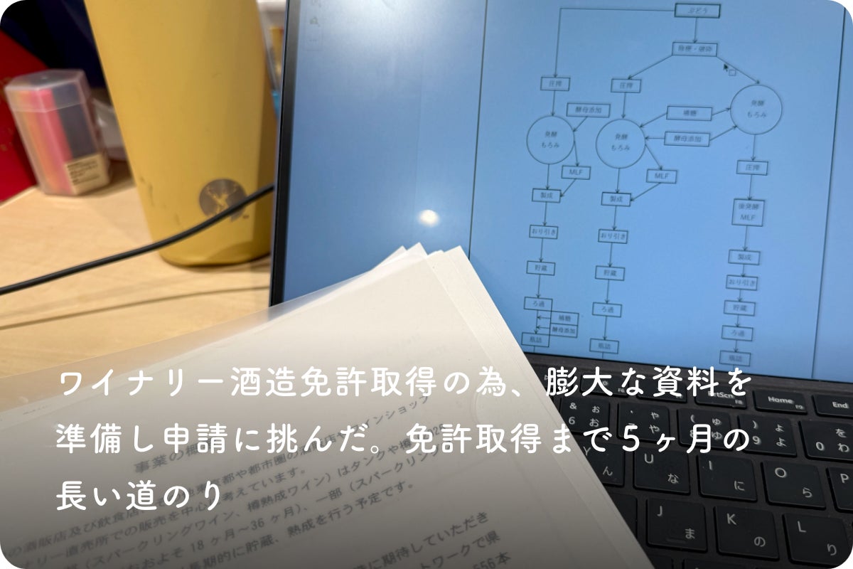 ワイン造りは国税庁の許認可が必要な事業の為、その書類整備や申請業務も半年近い時間をかけて膨大な資料を準備し申請を行いました。