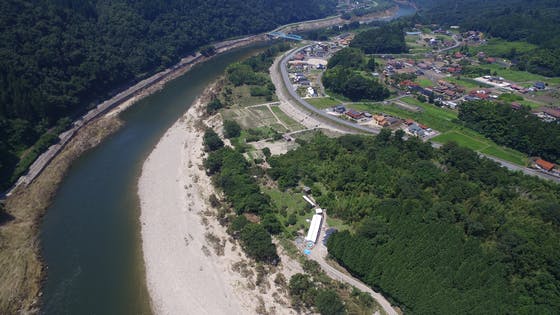 写真は、水が引いた後、江の川上空からドローンで撮影しました。(近所の方に写真をいただきました。)