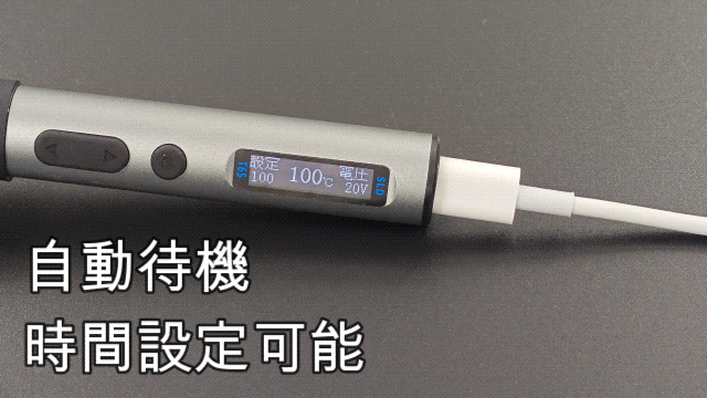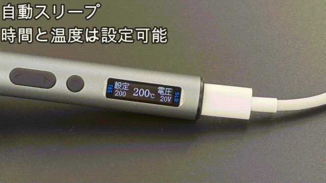 自動スリープ機能を搭載しており、一定時間使用しないと自動でスリープモードに入って電力を節約します。はんだごてのハンドルをわずかに揺らすことで、本体がウエイクアップします。スリープモードの時間と温度はカスタマイズ設定可能です。