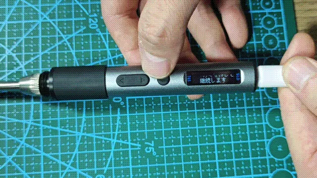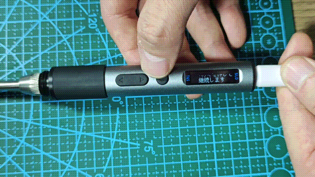 自動待機機能(シャットダウン)を搭載しており、一定時間使用しないと自動でシャットダウンします。この場合は「シャットダウン中」と「任意のキーを押して継続します」の表示が交互に点滅して、加熱が停止して室温に下がります。+ボタンまたは-ボタンを押して作業画面に戻ります。シャットダウンの時間はカスタイマイズ設定可能です。