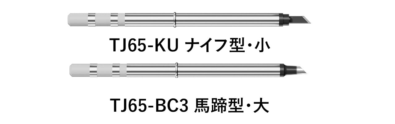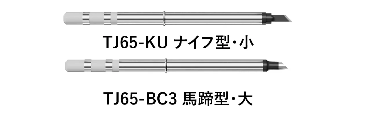 そのほか、TJ65-BC3馬蹄型大とTJ65-KUナイフ型小をお選びいただくこともできます。はんだごて先を交換すれば、この1本で様々な作業をスムーズに行えます。