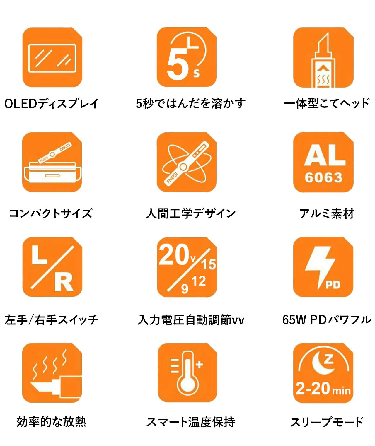 Q2:温度の上昇が遅く、最高温度まで温まりません。どうしてですか?A2:ご使用のアダプター、または USB Type-C ケーブルがPD/QC 規格で、65W 以上の出力に対応しているかご確認ください。この条件を満たしていない場合、フル出力でご使用いただけません。