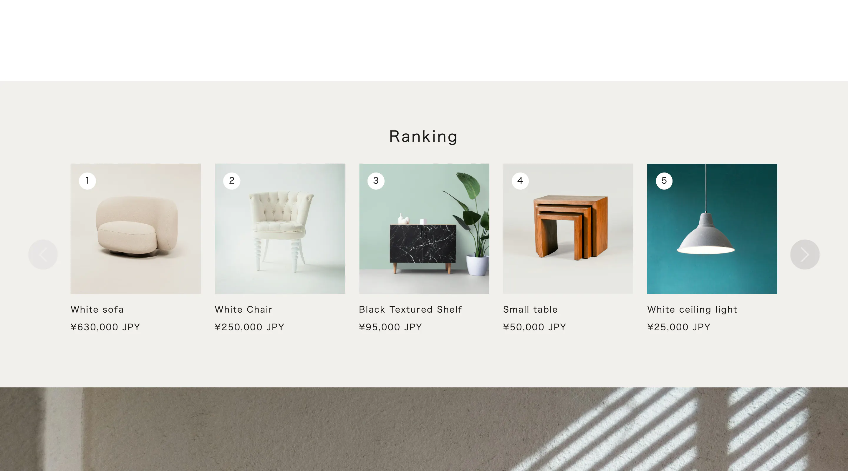 商品スライドのセクション。ランキング商品やおすすめ商品など特定の商品群を見せたいシーンでおすすめです。