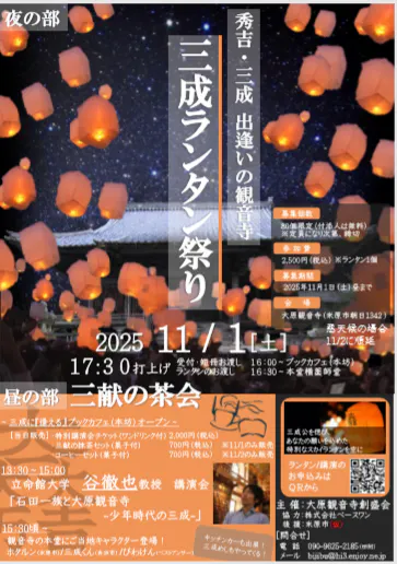 2025/09/16 15:53「秀吉・三成 出逢いの観音寺 三成ランタン祭り」のポスターが完成しました!イベント当日は大原観音寺の三成に『逢える』ブックカフェ(本坊)をオープンし、みなさまをおもてなしいたします。ブックカフェには石田三成に関する書籍が300冊以上保管されており、石田三成を深く知り・学び・体感できる時間をお楽しみください。また、石田三成研究の最前線で活躍されている谷徹也教授をお招きし、石田三成に関する特別講演会の開催。石田三成公を偲ぶ「三成ランタン」を夜空に打ち上げます。みなさまのご来場・ご参加を心よりお待ちしております。「立命館大学 谷哲也教授 特別講演会」「三成ランタン」はクラウドファンディングの返礼品だけでなく、下記申請フォームからも申し込みできます。※個数は先着順であり定員になり次第、募集を終了します。申込フォームhttps://docs.google.com/forms/d/e/1FAIpQLScOtFYJQdnat1zyeWer3jCi_-fbRsLEriu_xbaP_bx07pYFjw/viewform?usp=send_form もっと見る