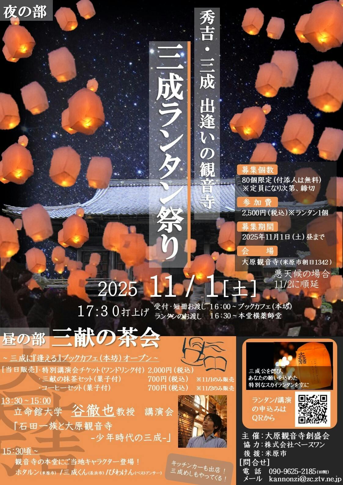 2025/09/16 15:53「秀吉・三成 出逢いの観音寺 三成ランタン祭り」のポスターが完成しました!イベント当日は大原観音寺の三成に『逢える』ブックカフェ(本坊)をオープンし、みなさまをおもてなしいたします。ブックカフェには石田三成に関する書籍が300冊以上保管されており、石田三成を深く知り・学び・体感できる時間をお楽しみください。また、石田三成研究の最前線で活躍されている谷徹也教授をお招きし、石田三成に関する特別講演会の開催。石田三成公を偲ぶ「三成ランタン」を夜空に打ち上げます。みなさまのご来場・ご参加を心よりお待ちしております。「立命館大学 谷哲也教授 特別講演会」「三成ランタン」はクラウドファンディングの返礼品だけでなく、下記申請フォームからも申し込みできます。※個数は先着順であり定員になり次第、募集を終了します。申込フォームhttps://docs.google.com/forms/d/e/1FAIpQLScOtFYJQdnat1zyeWer3jCi_-fbRsLEriu_xbaP_bx07pYFjw/viewform?usp=send_form もっと見る