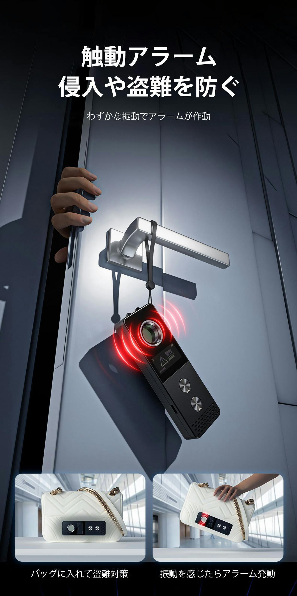 本製品は触動アラーム機能を備えており、ドアノブや窓に掛けるだけで振動を感知し、瞬時にアラームを発して異変を知らせます。