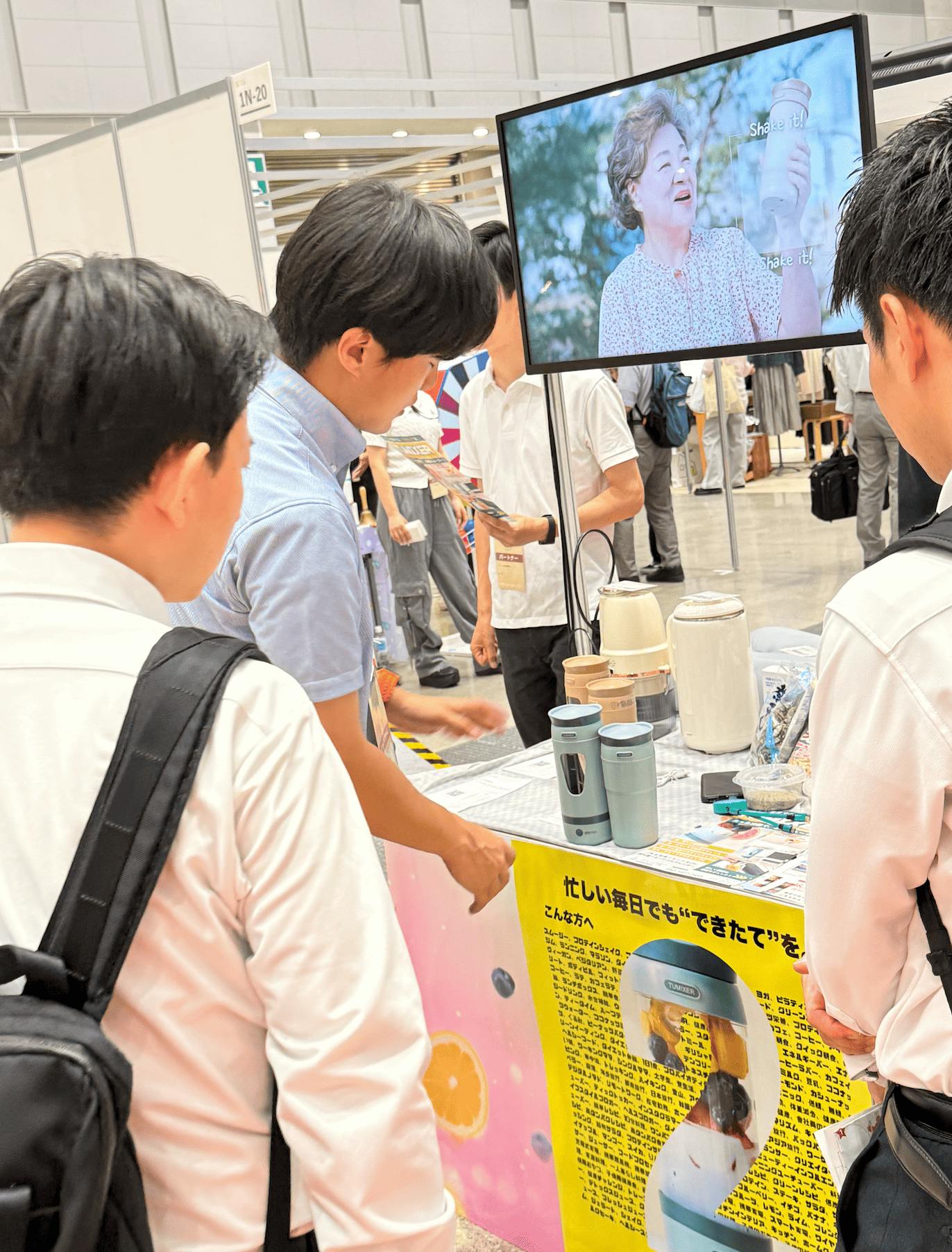 現在、東京ビッグサイトで開催中の展示会にて、新製品TUMIXERを直接ご紹介しています。多くの来場者の方々が当社ブースを訪れ、携帯性とパワフルさを兼ね備えたタンブラー型ミキサーの実際の使用感を直接体験されています。以下は会場の様子です。