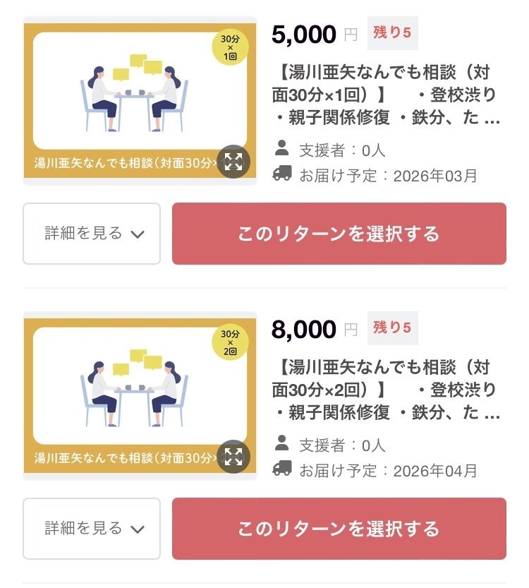 2025/10/12 11:57ご支援や応援をありがとうございます。書籍付きのリターンのご支援も多く、嬉しい限りです。やる気、元気がでます。実は、10月12日新しいリターンを追加しました。書籍の出版を待たずに11月から受けることができるリターンです。子育てに悩んでる、鉄分不足・タンパク質不足で悩んでる、ちょっと話を聞いてほしいなど「なんでも相談」のリターンです。特に登校しぶりのときの接し方はとても悩むと思います。1人で悩まずに、できるだけ早くお子さんに合う接し方を一緒に見つけてみませんか。今後とも応援をよろしくお願いいたします。 もっと見る応援に感謝の1週間でした!
