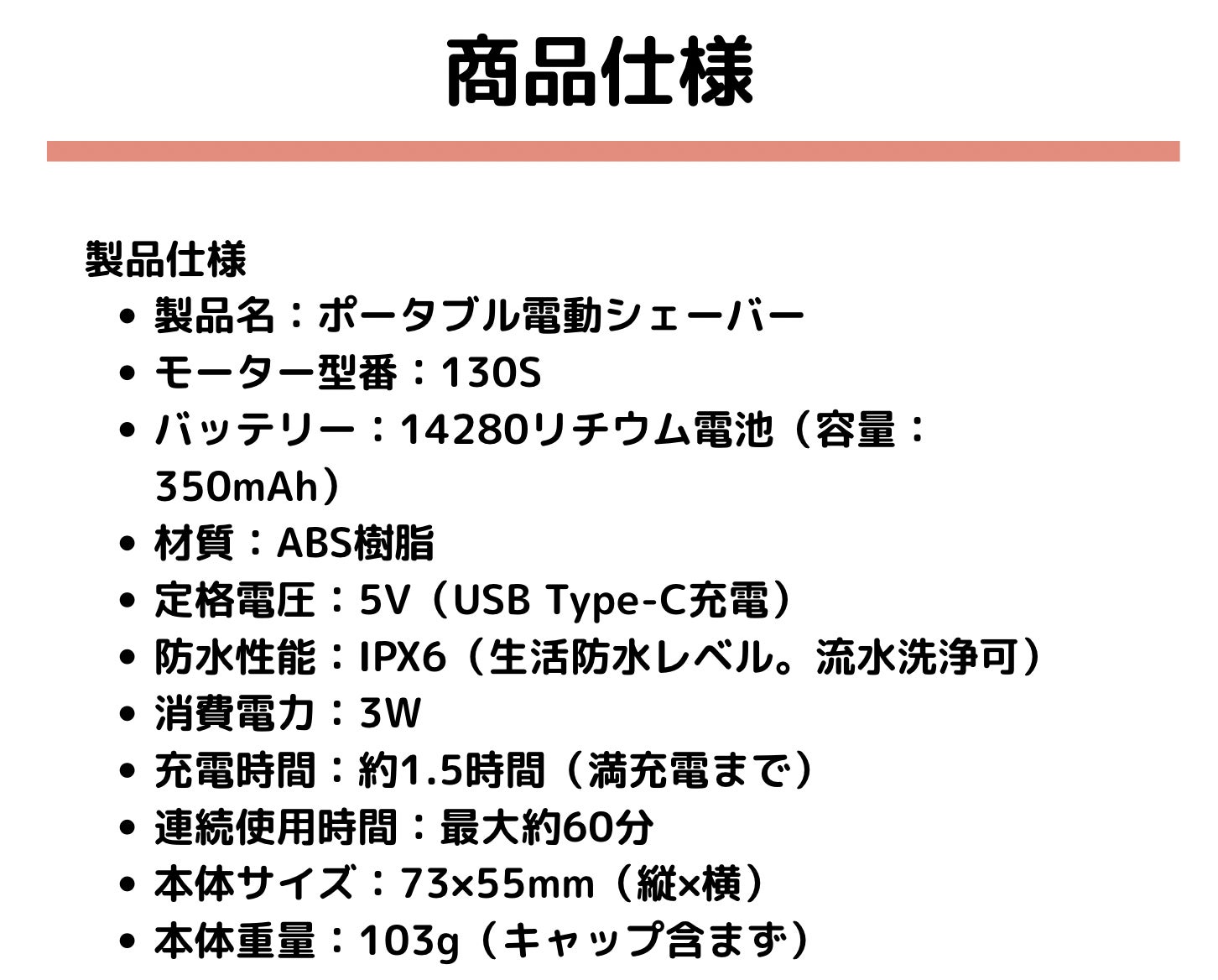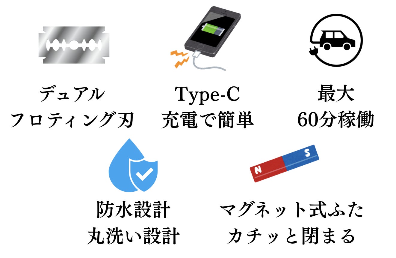 約 1.5 時間のフル充電で最長約 60 分連続使用(ヒゲの濃さや環境により変動)。