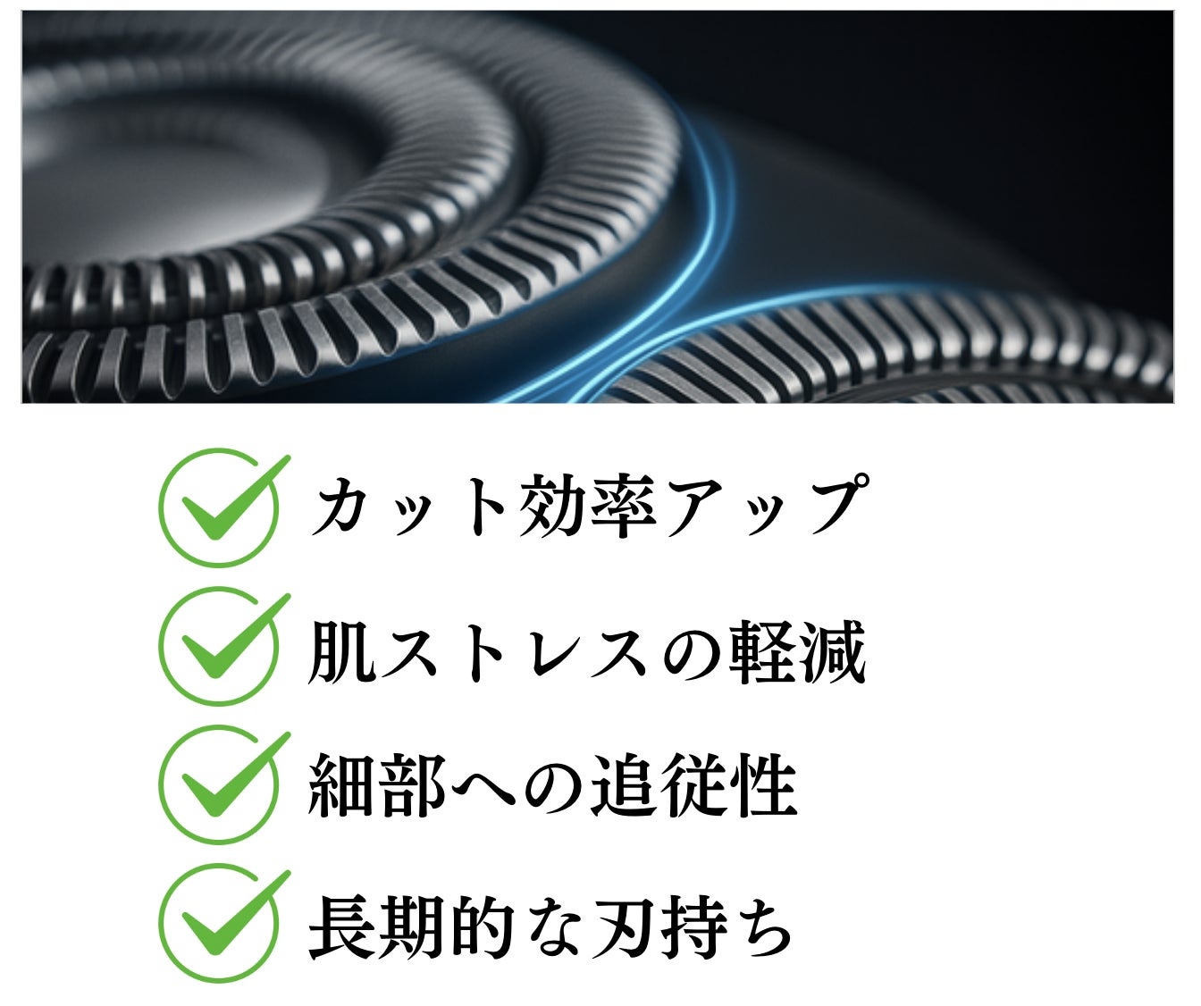 ステンレス製薄刃(約 0.05 mm)と内刃の二重構造で、ヒゲをスムーズにカット。